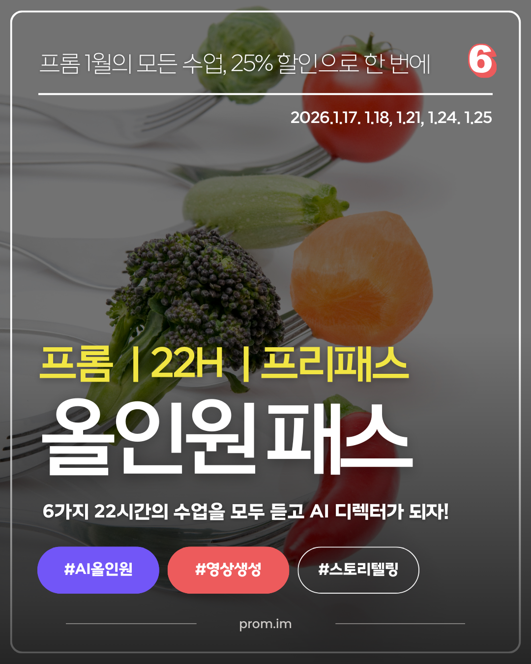 프롬의 1월 모든 수업을 25% 할인된 가격에 수강할 수 있습니다. AI 스토리텔링 클래스(8시간), AI 광고영상 제작 클래스(2.5시간), AI 올인원 생성 워크숍(10시간), AI 시네마 특강(1.5시간)까지. 올인원패스 수강생에게는 강의 자료 및 프롬프트 템플릿이 제공되고, AI 생성 크레딧이 일부 제공되며, 비공개 수상작 상영, 네트워킹과 1:1 피드백 특전 등의 혜택이 포함됩니다. ➡ 프롬 수업 새 시즌 만나보기