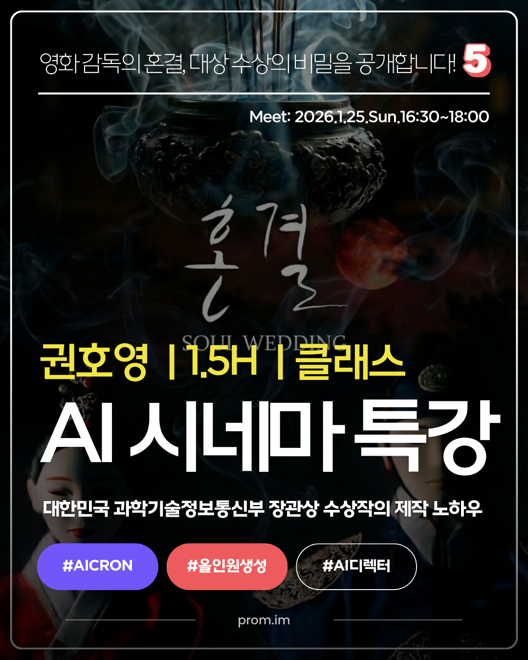 권호영 감독의 AI 시네마 특강은 그 간극을 메우는 첫 번째 기회입니다. '혼결'로 대한민국 과학기술정보통신부 장관상을 수상한 권호영 감독이 프롬에 옵니다. AI와 실사 촬영을 결합한 하이브리드 생성 기법, 영화제 출품 전략, 그리고 기술이 아닌 '이야기'로 심사위원의 마음을 움직인 비결을 공개합니다. 1월 25일(일) 오후 4시 30분, 90분의 특강입니다. 놓치지 마세요.