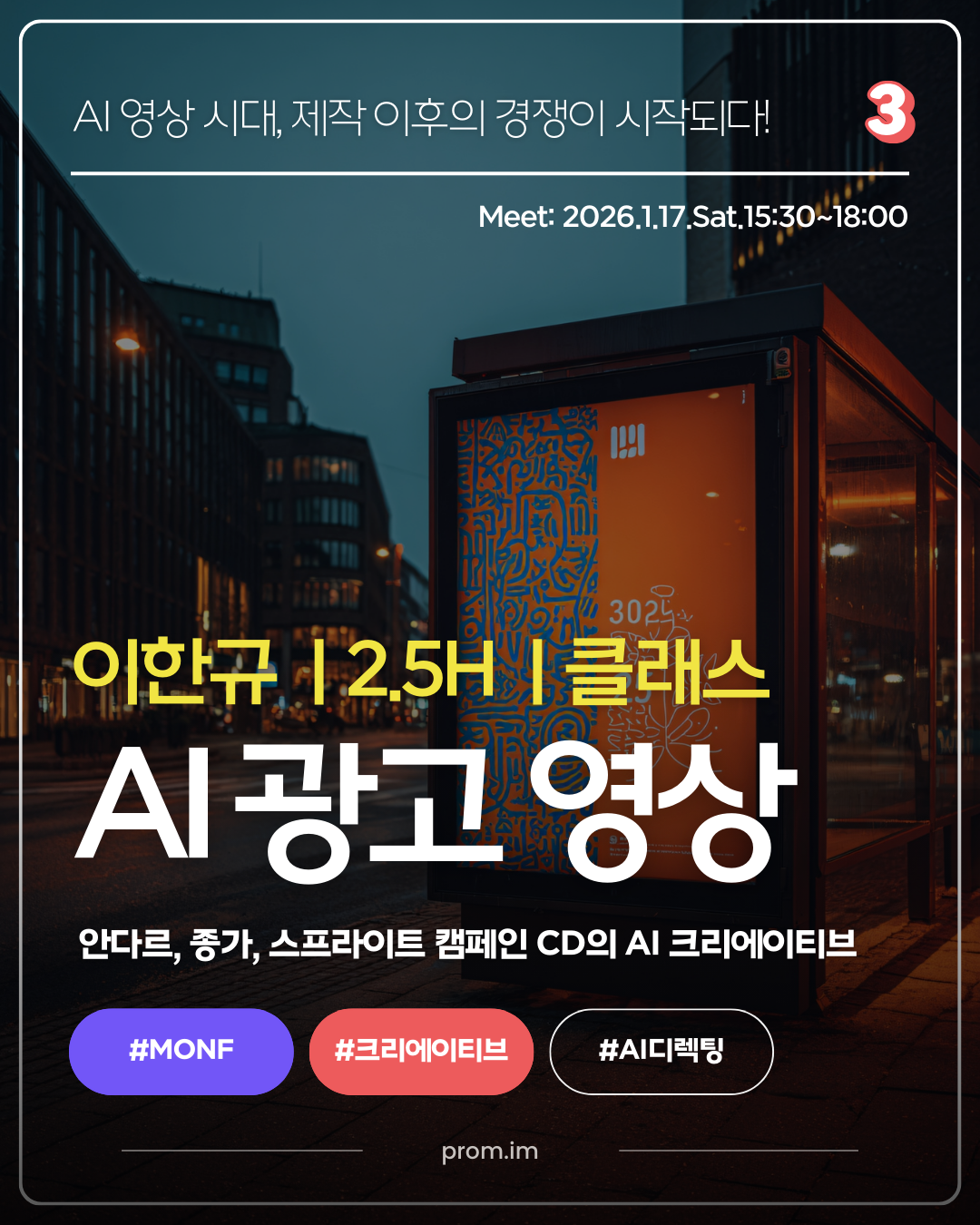 AI가 제작의 진입장벽을 낮춘 시대, 경쟁은 '제작 이후'에서 시작됩니다. 종가 뉴욕 타임스퀘어 광고, 안다르 '모두의 레깅스', 부라보콘, 스프라이트 캠페인을 크리에이티브 디렉션한 MONF의 이한규 CD가 AI 기반 제작 시스템 전환 전략을 공유합니다. 1월 17일(토) 오후 3시 30분, 2시간 30분의 집중 클래스입니다.