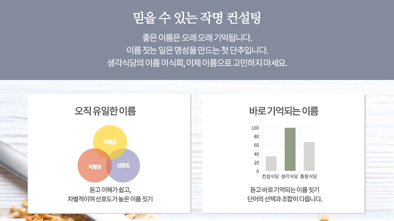 이름 미식회는 이런 요구로 태어난 메뉴다. 그 용하다는 한남동 생각식당에서 새롭게 출시한 특별메뉴라고 한다. 밑져야 본전 아닌가? 좋은 이름은 만나지 못해도, 식사는 할 수 있을 테니까. 다 먹고 살자고 이름 짓는 것 아닌가? 먹어보자, 생각식당 이름 미식회. 끝.