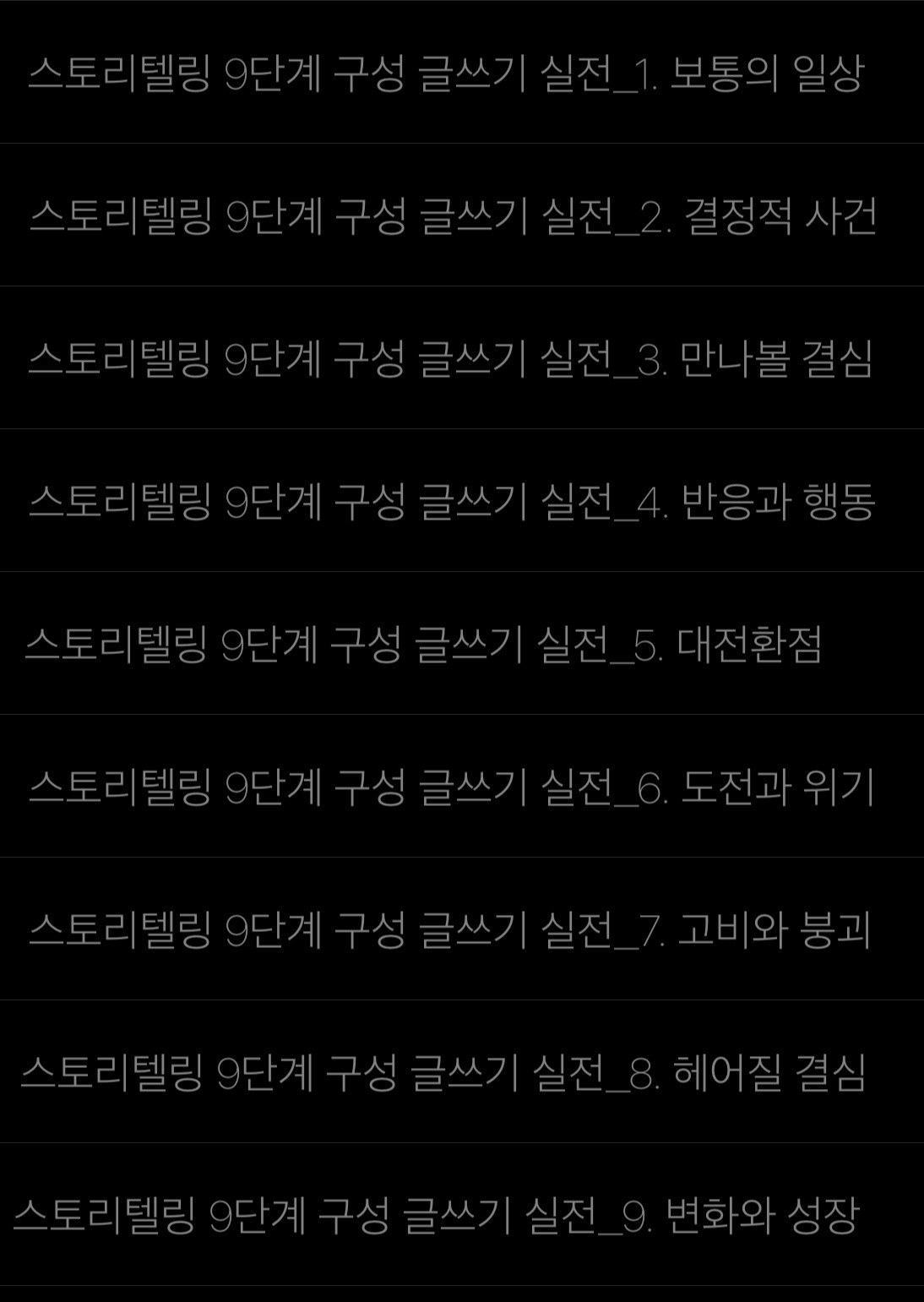 1회차 오리엔테이션에 이어, 2회차 글쓰기 이론과 도구를 익힌 뒤에 구성의 9단계에 맞춘 글쓰기 실전으로 들어갑니다. 스토리텔링 구성 단계에 해당하는 글을 써나가면 마지막 12회차에 인생 서사가 담긴 한편의 긴 글이 완성될 것입니다.