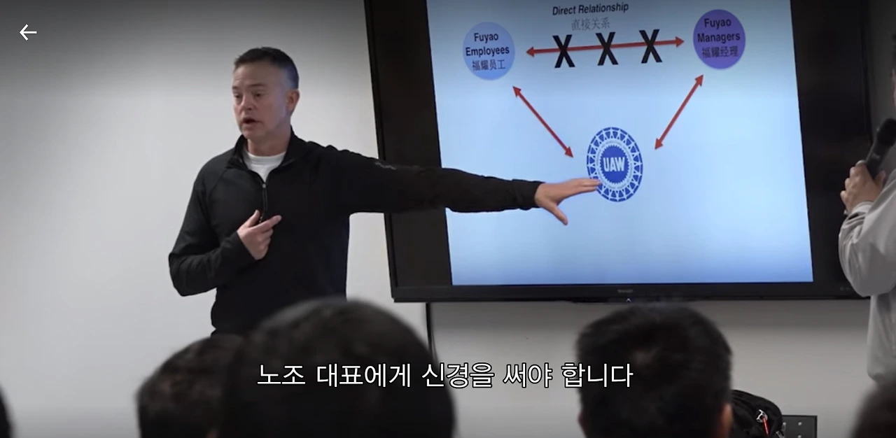 본사 방문자들은 귀국하고 나서 근무교대 모임을 테이블에 앉아서 하던 것을 중국 본사처럼 서서 정렬하여하는 방식으로 바꾼다. 그러나 푸야오 공장의 노사관계는 위기국면으로 치닫는다. 과거 GM에서 받던 시급의 절반 수준인 저임금과 안전사고로 인한 부상자 발생, 중국 간부들의 일방적 지시 방식 등이 분노와 불만을 쌓이게 하였고 노동조합을 만들자는 여론이 점차 힘을 얻게 된다. 공장 앞에서는 전미 자동차노조(UAW) 에거 나온 시위대들이 ‘노조 찬성’이라는 팻말을 들고 구호를 외친다.