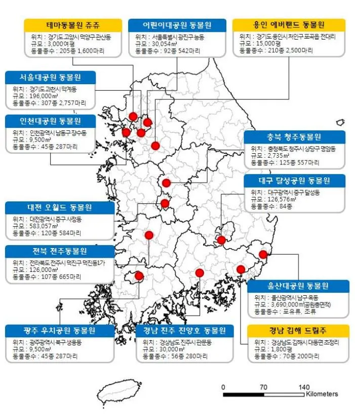 우리나라의 동물원 분포(지도출처: 강원발전연구원) 역사적으로 인간과 공간적으로 경쟁을 하거나 공간을 위협한 동물들은 대부분 무자비하게 죽임을 당했다. 호랑이, 표범, 늑대는 적으로 간주되어 한반도 야생에서 이미 사라졌고, 지금도 돼지 열병의 주범으로 낙인찍힌 멧돼지는 유해 동물로 지정되어 무자비하게 사살되고 있다. 인간의 영역에 들어온 이방인들은 그것이 동물이든, 식물이든, 아니면 미생물이든 간에 추방되었다. 추방된 동물들은 더 깊은 야생으로 숨어 들어가거나 멸종되었으며, 운 좋게 보호 가치가 있다고 판단된 종들은 '종의 유지와 보존'을 구실로 동물원에 끌려들어 왔다. 100㎢의 광대한 면적을 자신의 영역으로 삼아 사냥하는 백두산 호랑이를 30㎡ 안팎의 좁은 우리에 가두어 사육하는 행위는 동물원을 '종의 보존', '공존'의 장소라고 이름 붙이기에는 억지스러운 면이 있다.