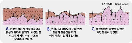 북한산의 가파른 절벽과 기묘한 모양의 암석들은 화강암과 관련이 있다. 화강암은 깊은 지하에 있던 마그마가 오랜 세월 서서히 굳으면서 형성되는 암석이다. 북한산 일대의 화강암은 중생대 중기(쥐라기) 대규모 지각운동이 있을 때 10km의 깊은 지하에서 서서히 굳으며 형성되었다. 이렇게 만들어진 화강암은 중생대 백악기와 신생대를 거치면서 지표면이 침식되어 사라지면서 지표면에 서서히 노출되었는데, 지표에 노출되자 대기와 접촉하면서 침식작용과 풍화 작용을 받게 되었다. 세월의 모진 풍파를 거친 화강암은 지금의 모습으로 서울의 북쪽에서 북한산, 도봉산, 수락산, 불암산이 되었다.