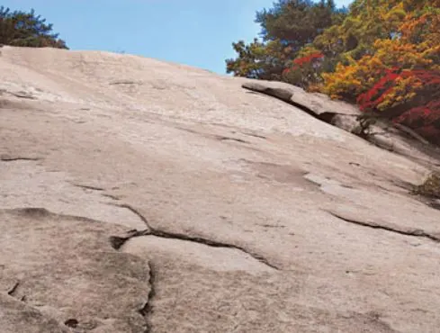 북한산 곳곳에 나타나는 판상절리. 오른쪽 사진에는 양파 껍질 벗겨지듯 박리현상이 보인다.