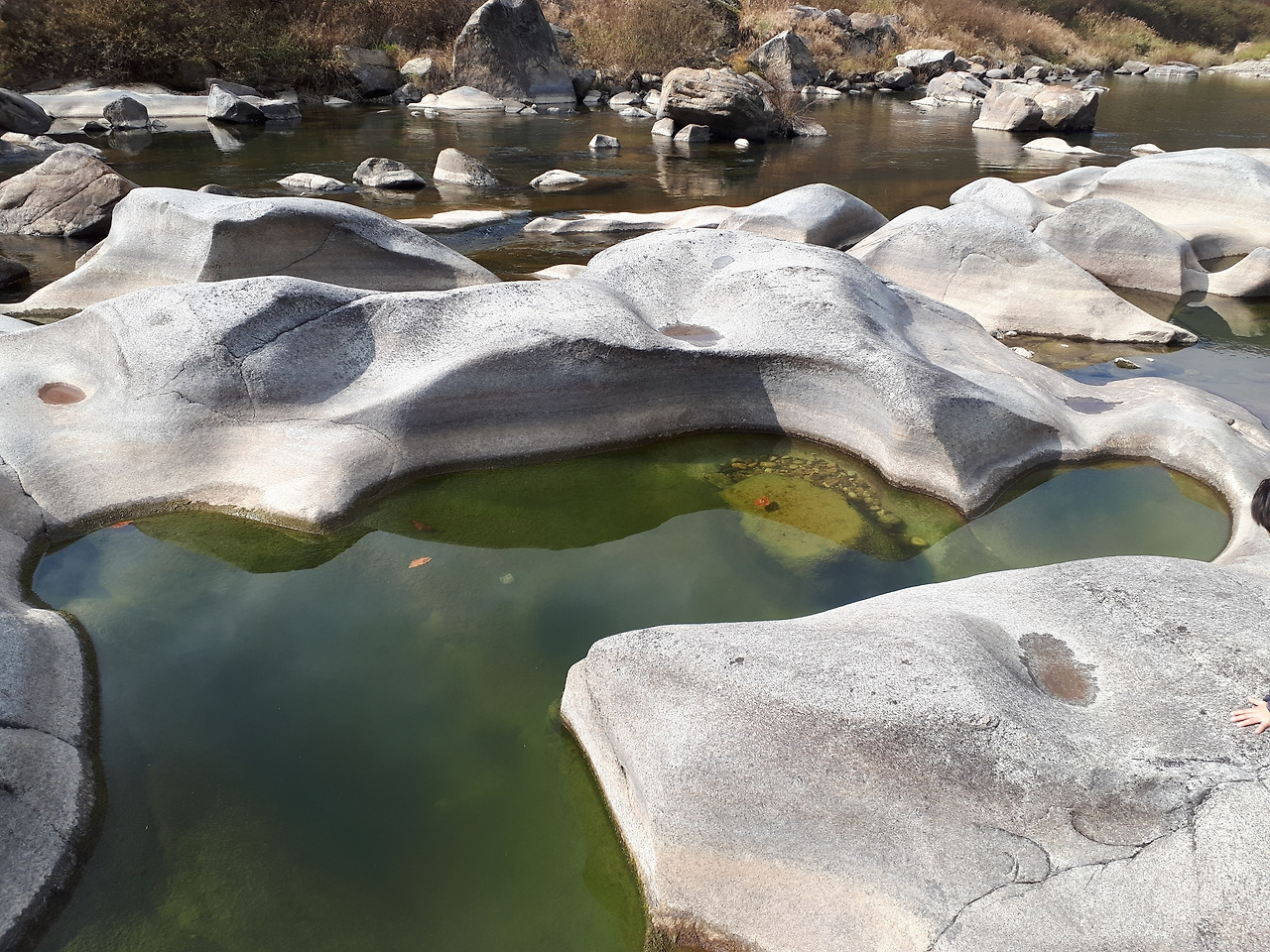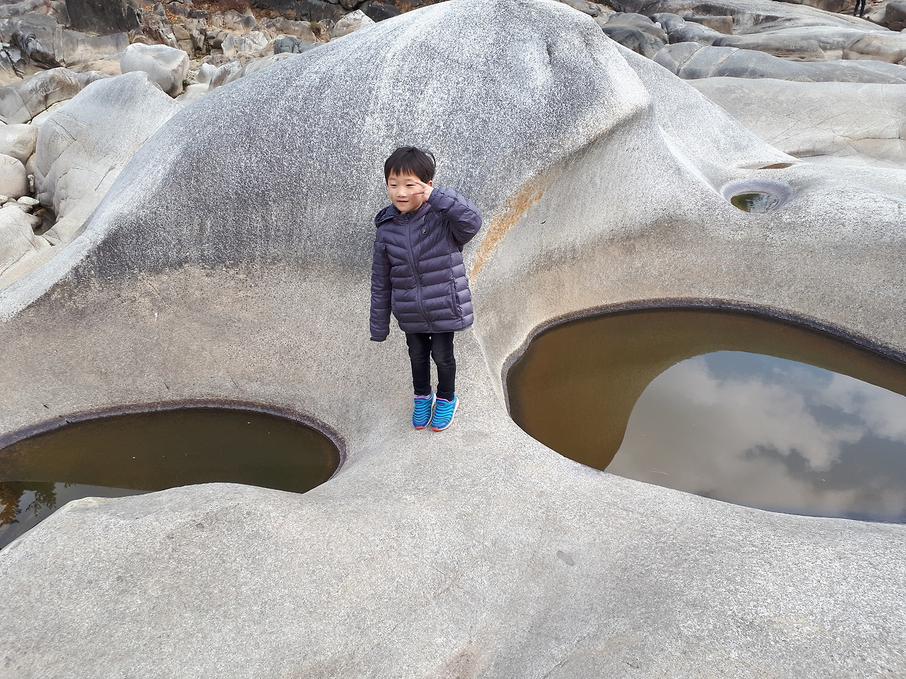 강원도 영월 요선암 일대의 포트홀 경관(포트홀의 크기를 보여주기 위해 아들을 등장시켰습니다.)