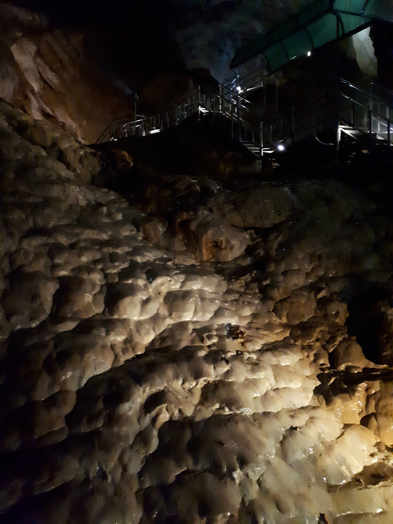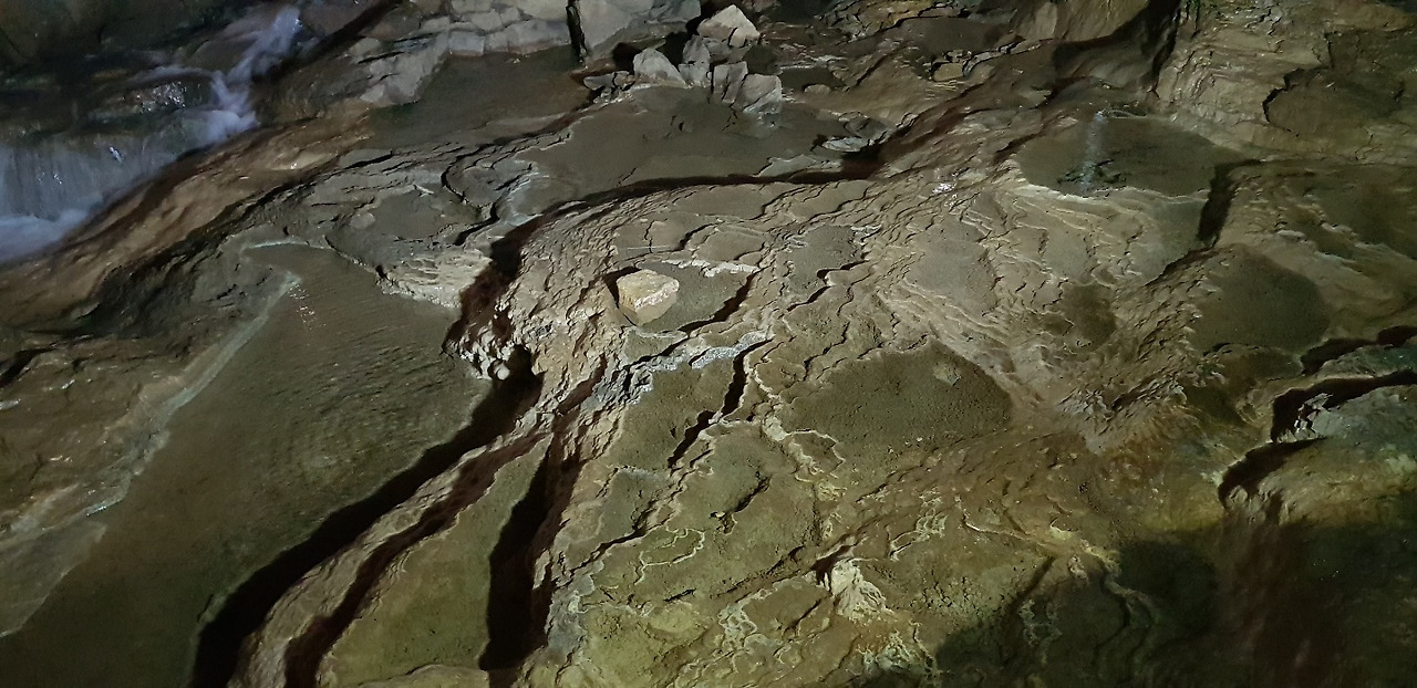 환선굴의 다양한 2차 동굴생성물들(유석(좌) , 기형 석순과 휴석소(우))