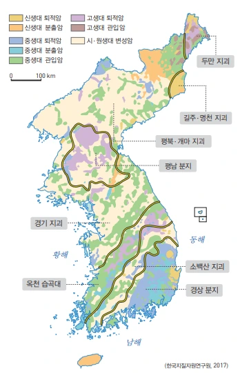 물은 석회암 지대를 흐르며 다양한 지형을 만들었다. 약 5억여 년 전 고생대 초기 스트로마톨라이트, 조개류, 산호류 등의 생명체들이 죽으면서 그 몸속에 있던 탄산칼슘 성분이 바다의 밑바닥에 차곡차곡 쌓여 암석이 되었는데, 이를 석회암(limestone)이라고 한다. 아래 지도의 평남 분지, 옥천 습곡대는 우리나라의 대표적인 고생대 퇴적층인데, 이 중 조선 누층군에 석회암층이 넓게 발달해 있다. 이 지역은 오랜 세월 융기와 침강을 거듭하다가 지금은 육지로 남아 있는데, 행정구역으로는 강원도 남부, 충청북도 북부 지역이 이에 속한다.