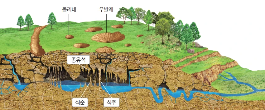 석회암 지형의 모식도(출처:한국지리교과서, 천재교육)