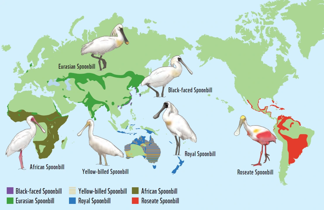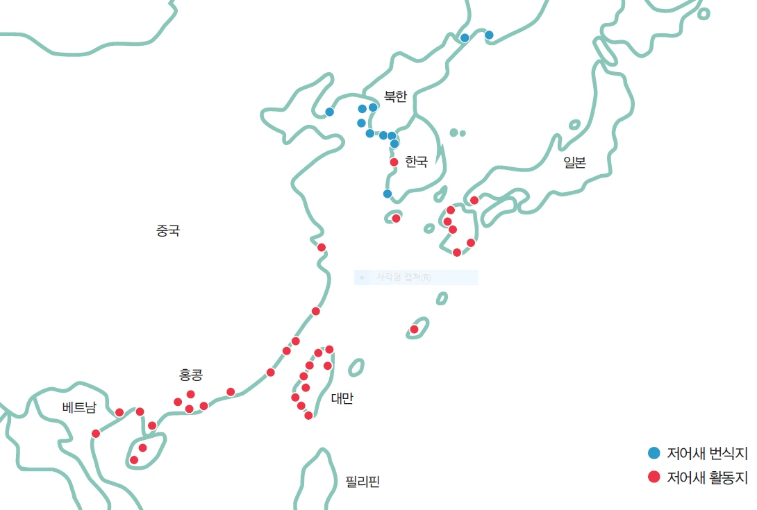 전 세계 저어새 분포 지역(출처: 저어새 가이드북 2018, WWF)
