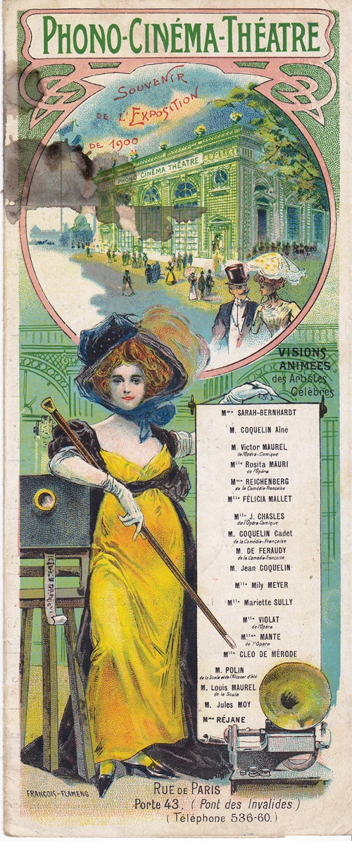 대중에게 미공개된 딕슨의 실험 유성 영화를 논외로 한다면, 최초의 유성 영화 중 하나로 꼽히는 <햄릿의 결투 Le Duel d'Hamlet>는 1900년 파리 만국 박람회에서 선을 보입니다. 뤼미에르 형제의 활동 사진이 상영된 지 불과 5년이 지난 시점이었죠. 당시 프랑스 연극계에서 꽤 유명한 여배우였던 사라 베르나르가 남장을 하고 햄릿으로 출연해 셰익스피어의 작품 속 한 장면을 연기합니다. 이 2분 남짓한 단편 영화를 만든 포노 시네마 테아트르(Phono-Cinema-Theatre)는 배우의 목소리를 따로 녹음해 영사기가 돌아가는 동안 원통형 축음기로 재생하는 방식을 채택해 영화를 상영했습니다. 당시 축음기는 아직 미완성에 가까웠기에 커다란 홀에 관객을 가득 채우고 영화를 상영할 수 없었고, 완벽하게 동기화된 기술도 보여주진 못했지만, 무성 영화 밖에 없었던 시절 영상에 소리를 입혔다는 점에서 기술적으로 무성 영화라고 보기 어렵습니다.