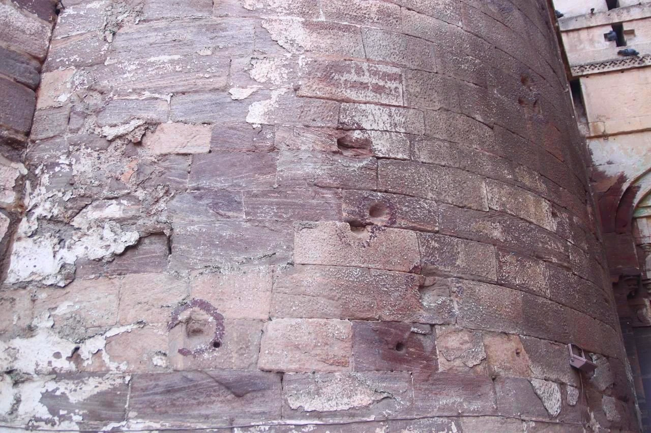 위의 사진의 빨간색으로 동그라미 친부분은 총포탄의 흔적이 고스란히보여주고 있다. 또한 메헤랑가르는 7개의 문을 통과해야 내부로들어갈 수 있는데 각 문에는 전쟁시 적군의 성의 칩입을 늦추기 위한 전략들이 숨어져 있었다. 적군이 문을 통과하기 위해 문을 부수기는 전투를 벌일 때, 적군의 전력의 소모는 엄청 났기 때문에 좁은 문앞에서는 적군의 전투력을 분산시켰을 뿐만 아니라 문을 부수기 위해서는 전면에 선 병사들의 죽음을 소모하였기 때문이었다.
