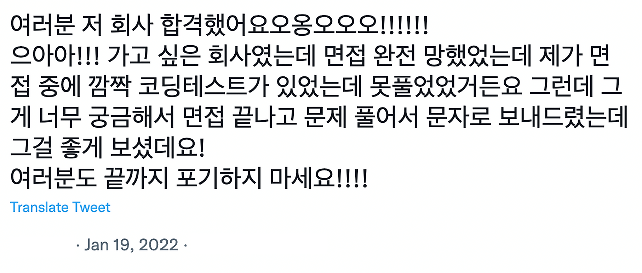 2022년 1월, 트위터에 올라온 감동적인 이 트윗은 지금도 계속 '포기하면 안 된다'라는 실생활 사례로 리트윗되거나 캡처되어 확산되고 있습니다. 처음 봤을 때도 감동적이었고 지금 다시 봐도 이 트윗을 올린 분이 대단하다는 생각을 합니다. 본받을만한 대단한 자세와 태도입니다.