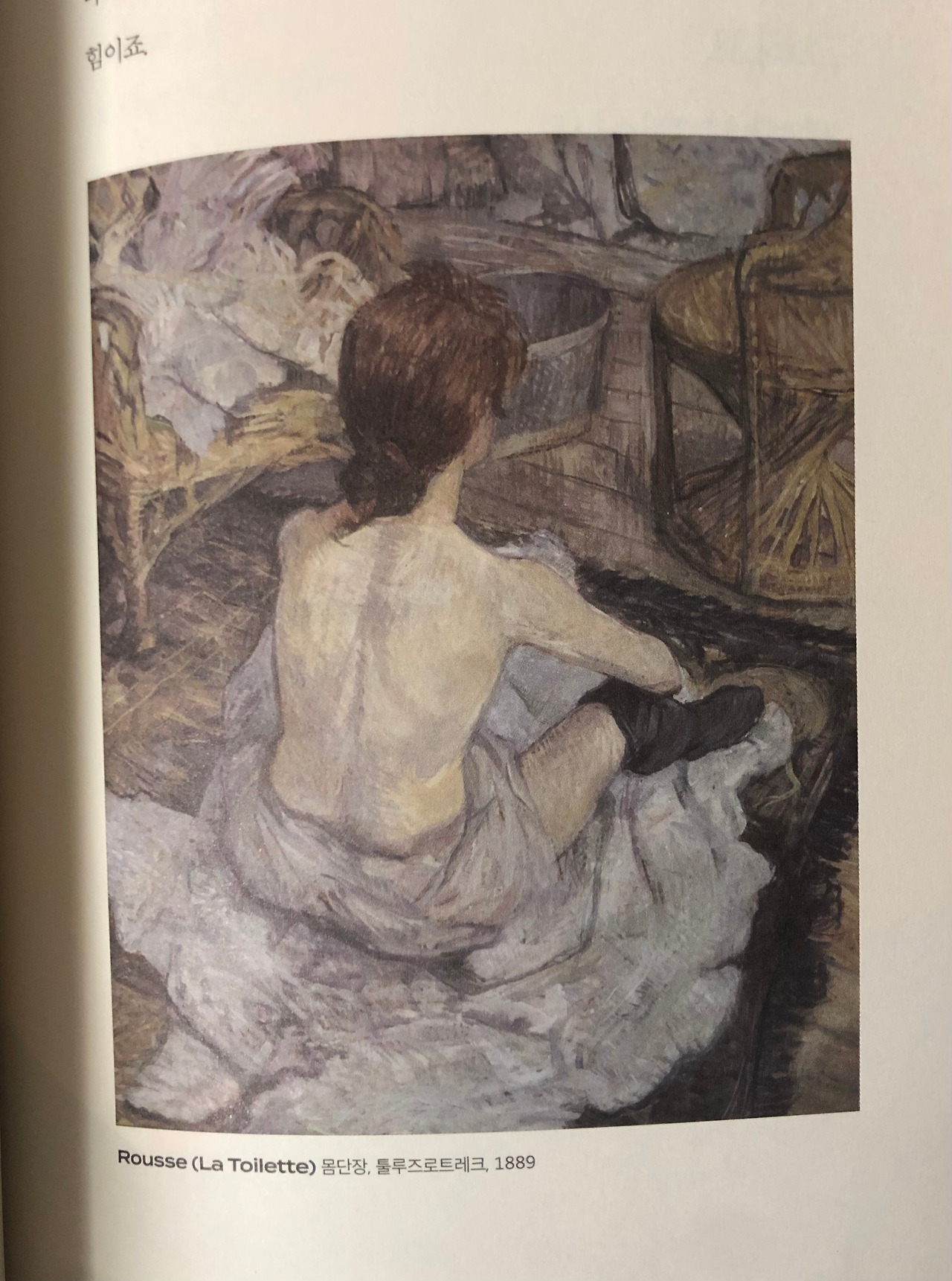 앙상한 뼈만 남은 가냘픈 여인의 몸단장은 세상에서 가장 슬픈 <몸단장>이라고 로트렉은 말하는 듯하다. 그녀가 가진 것은 돈의 수단이 된 몸뚱아리 하나. 돈 때문에 사랑하지도 않는 사람들 앞에서 보이는 웃음은 허하다. 오히려 울 수 있다면 좋으련만 웃고 떠들어야 하는 그들의 삶. 누군가에게 보일 앞모습을 치장해야 하지만 정작 자신이 치장할 이유를 찾지 못해 망연자실한 여인. 살아갈 이유도 힘을 낼 이유도 없는 그녀. 웃고 또 웃지만 채워지지 않는 텅 빈 가슴. 그 허탈함을 가슴속에서 비우고자 화려하게 치장하고 단장해도 보이는 것은 그녀의 고달픔과 고독함. 따스함도 온기도 늘어진 옷 사이 어디론가 숨어버려 차디차다. 화려함 뒤에 감춰졌던 그녀의 뼈와 살은 부서질 듯 아파 보이고 파리하고 핏기가 없다. 그녀의 몸을 버틴 팔의 가녀림이 애처롭다.