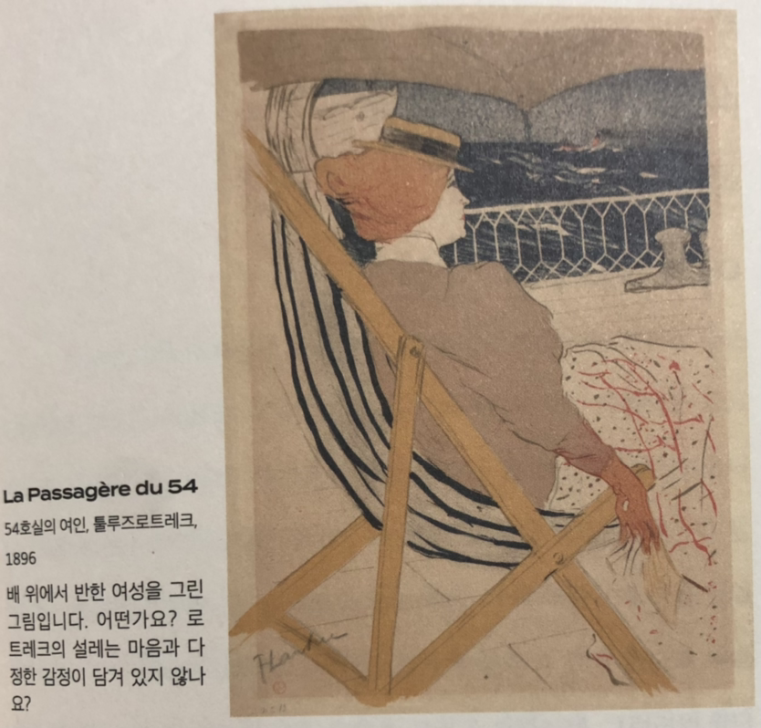 로트렉은 물랭루주 사장을 만나 "자신은 그림을 그리는 사람인데 그 안에서 일어나는 모든 일들을 다 그려줄 테니 부탁을 들어줄 것을" 제안한다. "부탁은 두 가지였는데 물랭루주의 무대 맨 앞자리는 자신이 언제든지 앉을 수 있도록 비워둘 것, 그리고 끊기지 않게 술을 계속 가져다줄 것. 돈은 조금도 필요하지 않다는 말도 덧붙"(p109) 인다. 그 후 로트렉은 물랭루주에서 만난 사람과 사건들을 그림으로 표현한다.