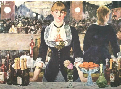 - 관객이 서 있는 자리는 한 군데가 아니다. 따라서 화가가 그림을 보아야 하는 관객의 자리를 지정해 놓는다는 것은 작가가 그림의 주도권을 쥐고 있는 것이다. 마네는 폴리 베르제르 바에서 회화가 그동안 가지고 있던 작가의 주도권을 내려놓는다.