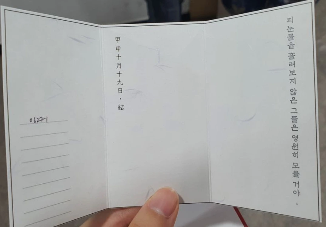 보통 여러 번 관람하지는 않는 편이라 잘 찍지 않는데, 라 레볼뤼시옹의 도장판은 만듦새가 좋아 기념 삼아 하나 찍어서 보관하기로 했다. 매 회 관람 시마다 극 중 내용과 관련 있는 대사를 한 줄씩 찍어준다.
