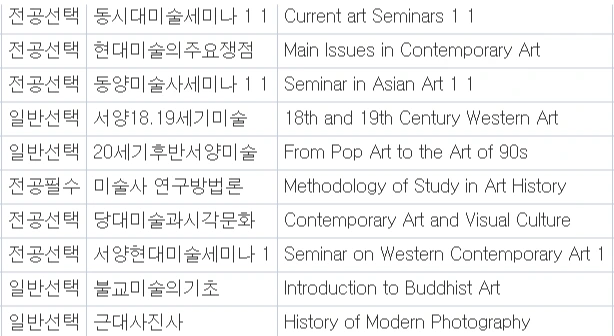 우리 과의 커리큘럼 중 전공선택은 크게 한국미술, 서양근대, 서양현대, 미술비평의 네 가지 계열로 분류되어 있다. 졸업을 위해 계열별로 최소 한 과목씩 수강해야 한다. 계열별로 전임교수님이 한분씩 계셔서 보통은 한 과목만 듣게 된다면 전임교수님의 수업을 듣는다. 나는 서양현대미술(이라고 적혔으나 사실 동시대라고 표현하는 게 더 적절하지 않을까 생각한다)을 선택했다. 두 학기 동안 서양현대미술 계열 밖의 과목으로 들었던 것은 동양미술사 세미나와 미술사연구방법론(줄여서 미연방)이다. 동양미술사는 한국미술계열이며 미연방은 전공필수과목으로 1학년 1학기에 동기들이 모두 모여 듣는 게 보통이다.
