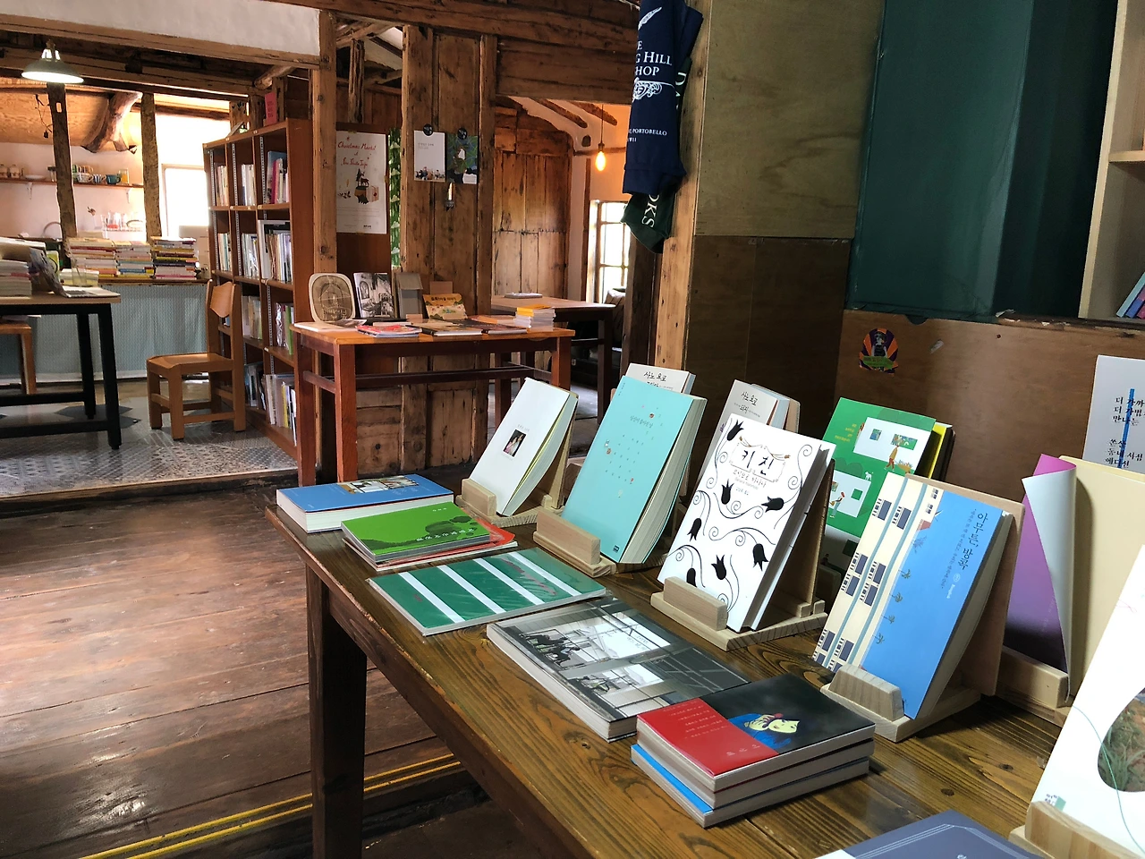예쁜 마당을 지나 문을 열고 안으로 들어가니 친근한 마루와 책들, 그리고 사장님께서 저를 반겨주시더라고요. 게다가 친절한 사장님께서는 음료를 파는 곳이 아닌데도 불구하고, 더운 날씨에 시원하게 마시면서 천천히 둘러보라고 차가운 녹차를 주셨는데요. 정말 감사했어요. :-) 덕분에 저는 자리를 잡고 앉아서 책들을 읽어보기 시작했습니다.