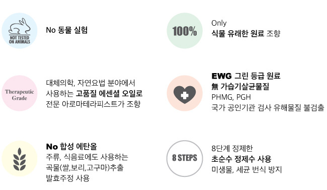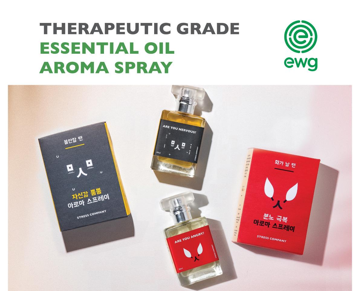 에센셜 오일은 불순물 희석 여부와 효능을 나타내기 위한 특정 성분들의 함유 비율들로 등급이 나누어집니다. 스트레스컴퍼니의 아로마 스프레이는 아로마테라피 임상에서 사용하는 테라퓨틱 등급(Therapeutic Grade)과 불순물이 없는 에센셜 오일을 사용했습니다. 또한 한국환경산업기술원을 통해 유해 성분인 폼알데히드, 메탄올, 벤젠, 글리옥살, 트리클로로에틸렌이 검출되지 않았음이 확인되었으니 안심하고 사용하셔도 됩니다.