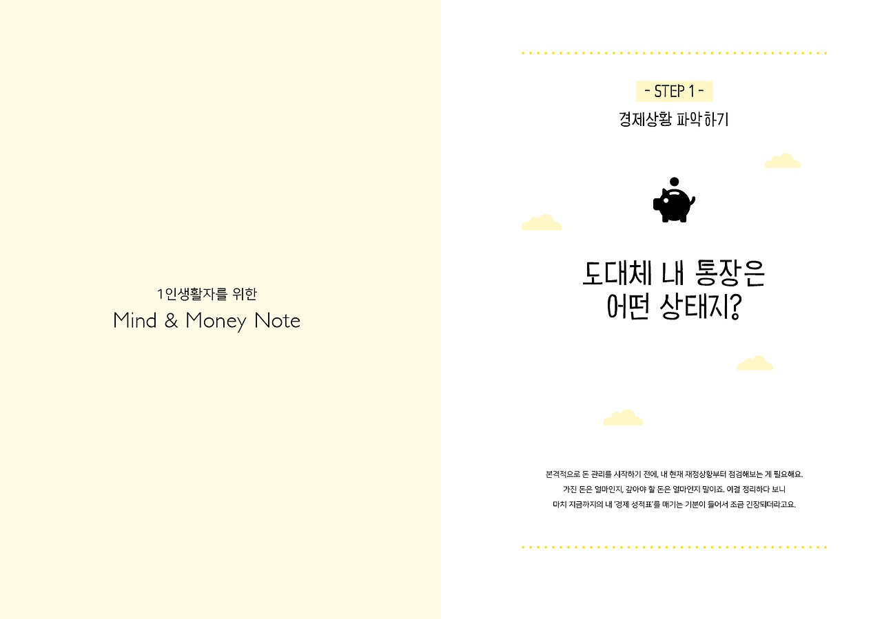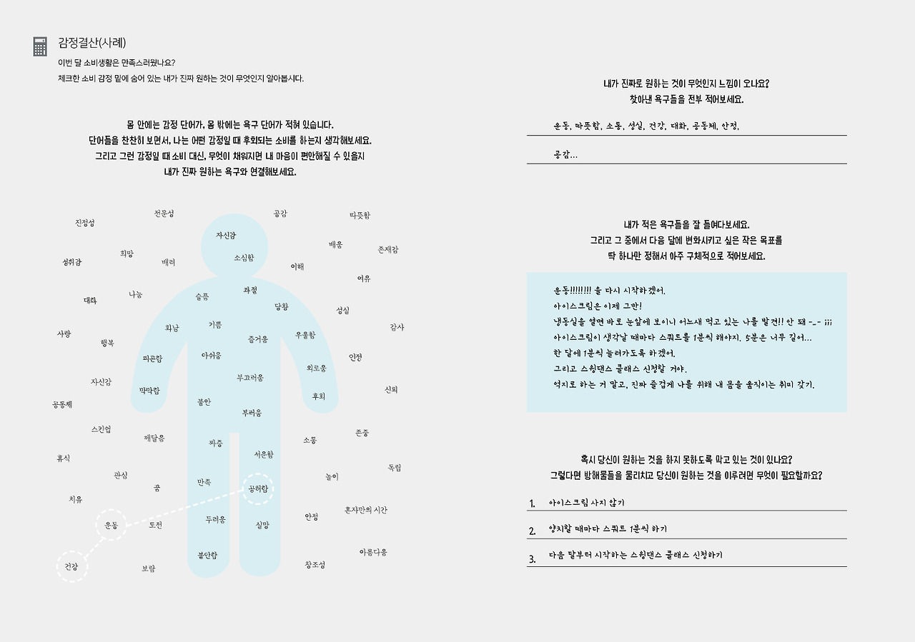 그런데 그 모든 일이 지나간 다음 날, 당신의 기분은 어땠나요? 혹시 내가 왜 그런 짓을 했을까 바보 같다며 후회하고 자책하지는 않았나요? 바로 그것이 감정 관리가 중요한 이유입니다. Mind & Money Note는 당신이 더 이상 감정에 휩쓸려 돈을 쓰고 나서 후회하는 일이 없도록, 더 나아가 당신 감정 밑에 깊숙이 숨어 있는 당신의 진짜 욕구를 발견해서 당신이 더 행복한 소비생활을 해나갈 수 있도록 힘껏 돕겠습니다.