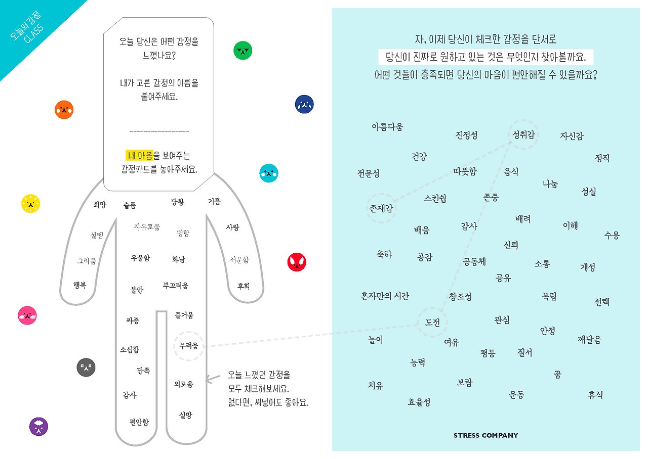 오늘의 감정 워크지는 제가 모임이나 강의를 할 때 항상 활용하는 것으로 자신의 감정과 욕구를 연결하는 도구입니다. 내 마음 밑에는 내가 원하는 것들이 숨어있기 때문에 자신의 감정만 제대로 인지해도 내가 지금 무엇을 원하고 있는지 그리고 무엇이 필요한지를 알 수 있게 됩니다.