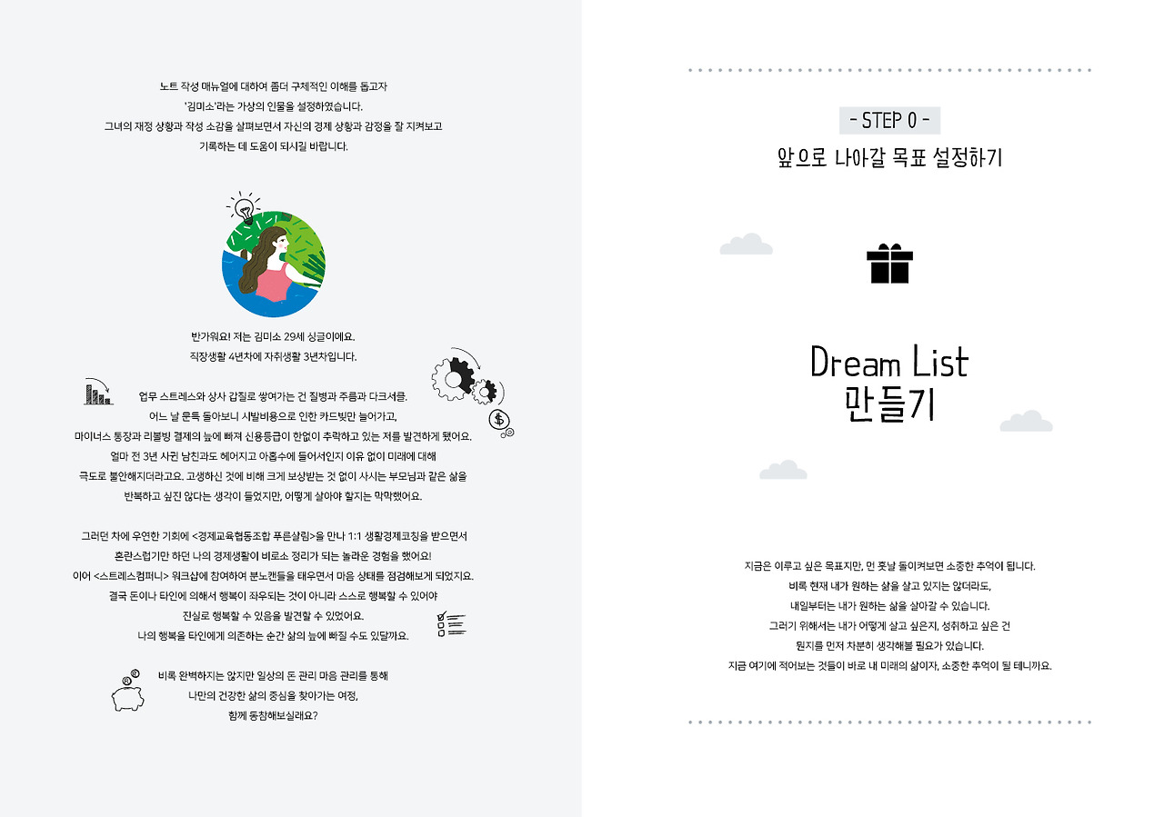 진짜 내가 무엇을 원하는지 돈을 모으고자 하는 진짜 목표를 찾기 위해 Dream List를 만들고, 현재 나의 상태를 되돌아본 뒤에 앞으로 어떻게 소비할지 계획을 세웁니다. 그리고 나의 지출 내역에 감정 스티커를 붙이면서 잘한 소비와 후회되는 소비를 체크하다 보면, 다음 달에는 어떻게 달라지고 싶은지 목표가 뚜렷이 보일 거예요. 그렇게 1년을 우리와 함께한다면 어느새 당신의 Dream에 다가가 있는 모습을 발견할 수 있을 거예요~