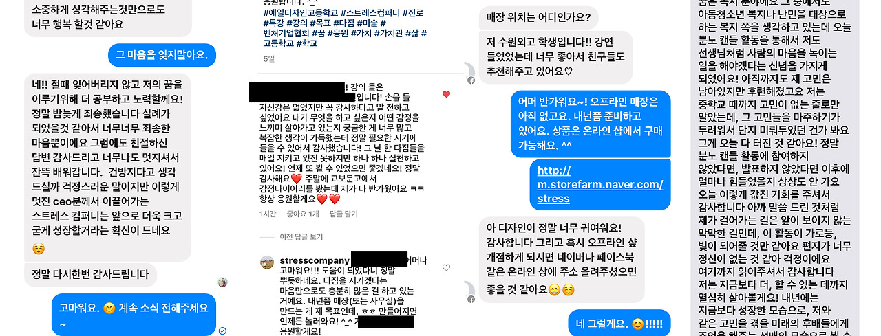 제가 "안녕하세요. 스트레스컴퍼니 대표 이남희입니다"라고 소개를 하면, 많은 분들이 두 가지 반응을 보이시곤 하는데요. "와 어떻게 스트레스로 회사를 만들 생각을 했어요? 진짜 기발하다."라는 반응과 "스트레스 만드는 회사예요? 왜 NO STRESS가 아니에요?"라는 반응입니다.