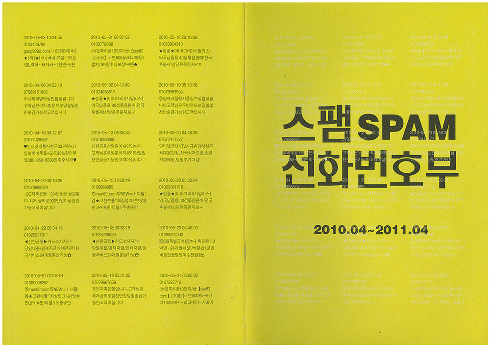 분노 캔들의 제작과정에 대해서는 1화에서 전해드렸습니다. 이렇듯 저는 제 자신에게 닥친 시련에 맞서기 위해 힘들다고 구시렁대는 과정에서 힘을 얻고 그 에너지로 무언가를 만들어내며 시련을 이겨낼 수 있었습니다. 그렇게 저라는 사람이 지속적인 생산자로서 살고 싶은 사람이라는 것을 서른이 넘어서야 깨닫게 되었는데요. 그것을 깨닫는 단서가 되었던 작업 중의 하나가 바로 2011년에 제작한 '스팸전화번호부'입니다.