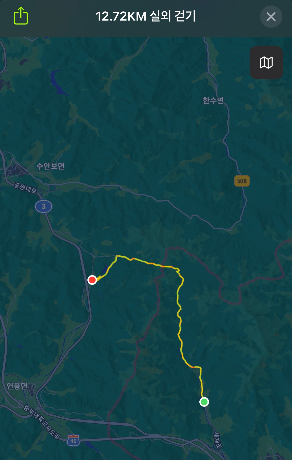 사실 끄트머리에 길이 어떻게 이어지는지는 잘 몰랐지만 어쨌든 길이야 있지 않겠느냐는 심정이었다. 일단 수옥폭포를 목적지로 두기야 했다. 정 길이 없으면 없는 대로 돌아 나오면 되겠다는 안일한 생각의 산행은 그렇게 시작되었다. 카카오맵과 네이버 지도 모두 4-5시간의 긴 산행을 예고하기야 했지만 결코 길이 없다고는 하지 않았으니 아무렴 길이야 있겠지.