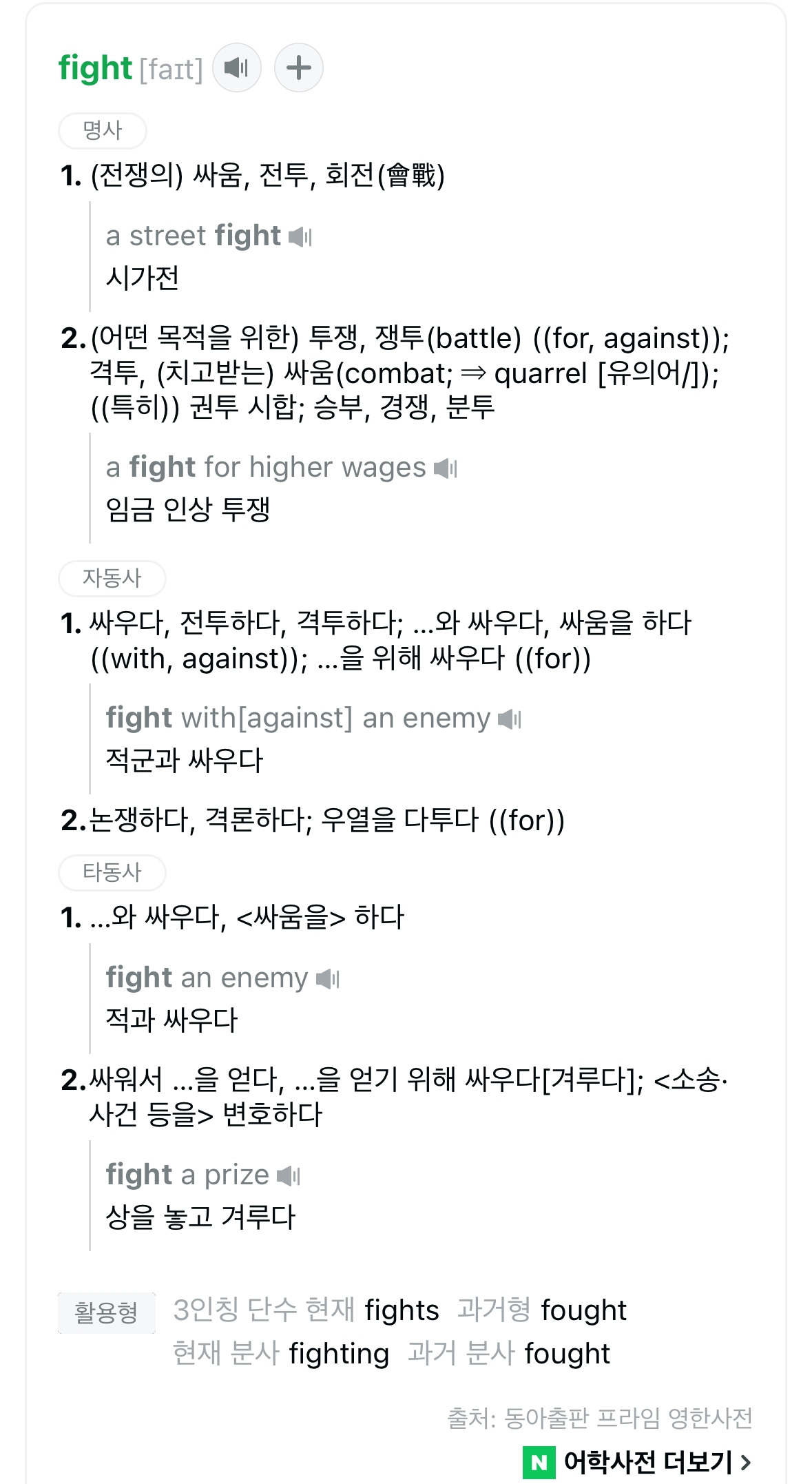 좌우지간 이 ‘파이팅’이라는 표현을 곱씹고 있는데 별안간 좀 이상하게 느껴졌다. 그 의미 때문이다. 파이팅, 즉 fighting이란 것은 fight와 ing가 결합된 형태이다. 여기서 핵심은 fight의 뜻인데 사전을 찾아보면 다음과 같다: 싸우다, 투쟁하다, 겨루다.
