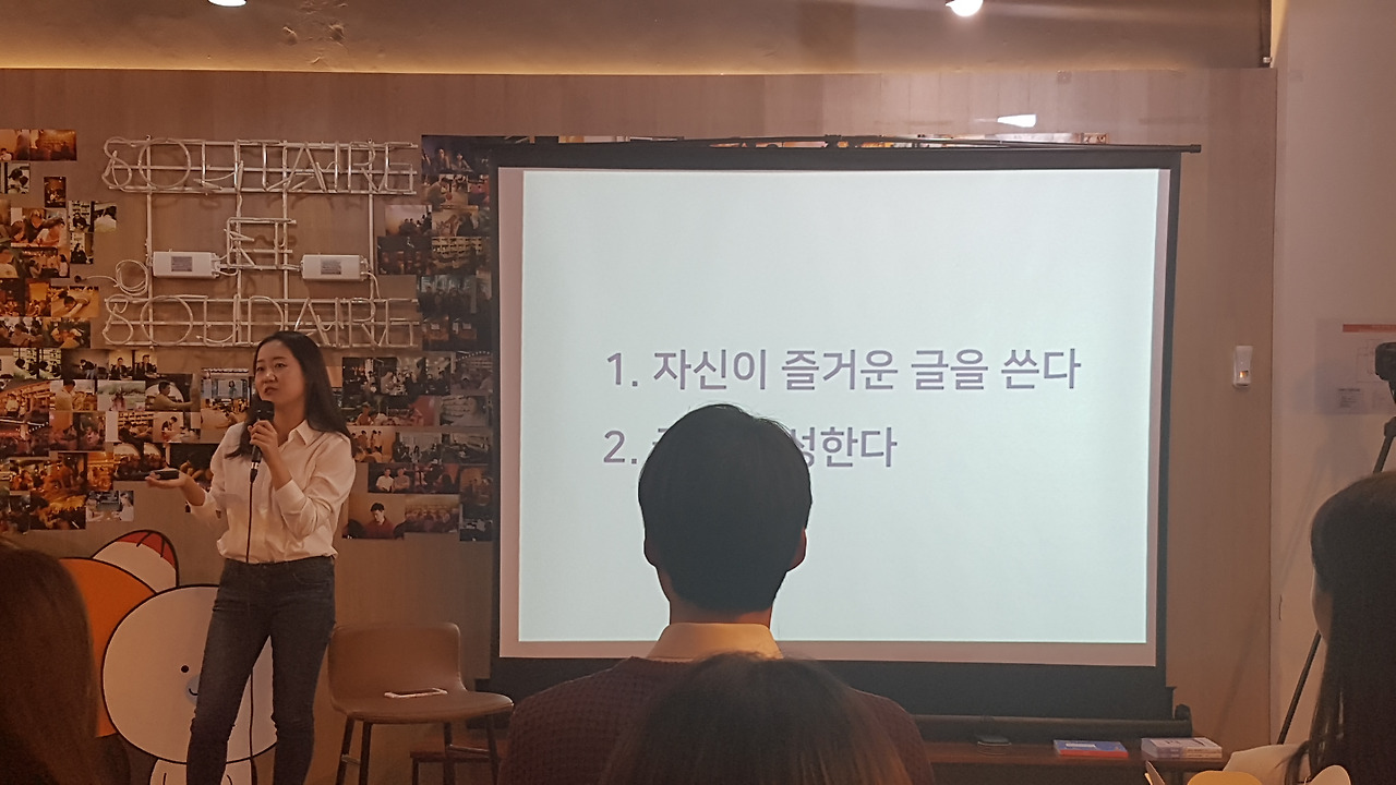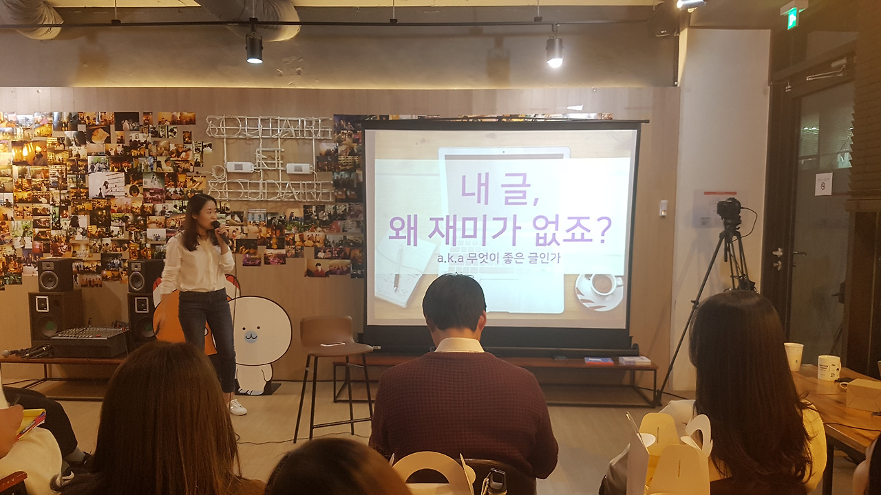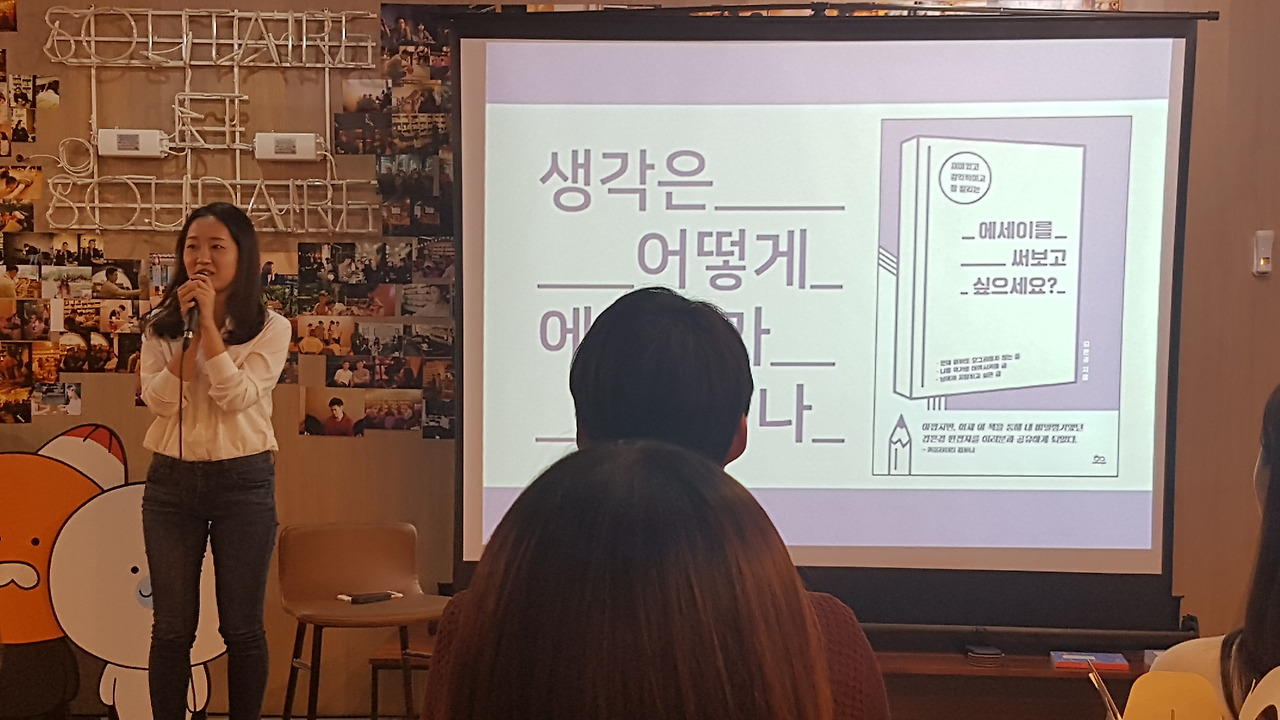 오늘 강연자인 김은경 님 등장. 김은경 님은 출판사에서 편집자를 하다가 작가로 데뷔하신 케이스란다. 주제는 '에세이 쓰기'.