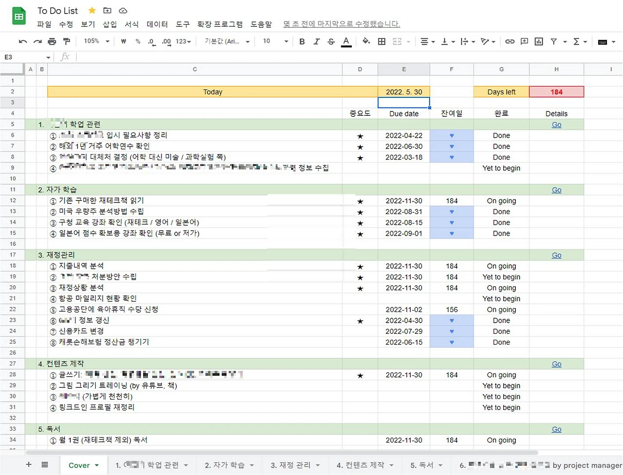 저 같은 평범한 회사원은 배운 도둑질이 엑셀이랑 파워포인트 뿐이네요. 하하하. 사무실에서 지겹도록 볼 때는 몰랐는데, 그 하얀 네모칸들도 이렇게 생활을 가다듬을 때 써보니 그 나름대로의 쓸모가 있었습니다. 살림살이라는게 의외로 자잘히 기억할 게 많은데 핸드폰 속 메모장에만 기록해 두기엔 너무 복잡하고 비효율적이더라구요. 예전 어머니가 가계부에 빼곡히 적어놓으셨던 것들이 생각이 났습니다. 아마 그것의 디지털 버전이라고 봐야겠지요.