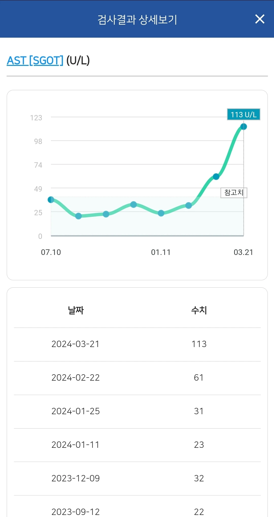 내 몸 이야기를 하자면, 현재 몸 상태가 썩 좋다고는 할 수 없다. 화농성 한선염은 분명히 좋아진게 맞고 이 상태가 오래도록 유지되었으면 좋겠는데 간 수치가 높아져서 걱정이다. 우루사 200mg을 한 달 동안 꾸준히 복용했기 때문에 간수치가 낮아졌을 것이라고 생각했다. 하지만, 검사 결과를 보니까 AST가 오히려 우루사 복용 이후 높아졌다. 간수치를 볼때는 간 효소인 AST와 ALT를 중점적으로 본다. 감마GT와 빌리루빈과 같은 수치도 참고하는 걸로 알고 있다. 우선, 나의 경우 이번 검사 결과에서 AST가 113, ALT가 105가 나왔다. 둘 다 병원 기준으로 40 정도가 정상 기준이다. 정상에 비해 거의 2배 이상 높다. AST의 경우 저번에 60정도였는데 우루사 먹고나서 오히려 올랐다.