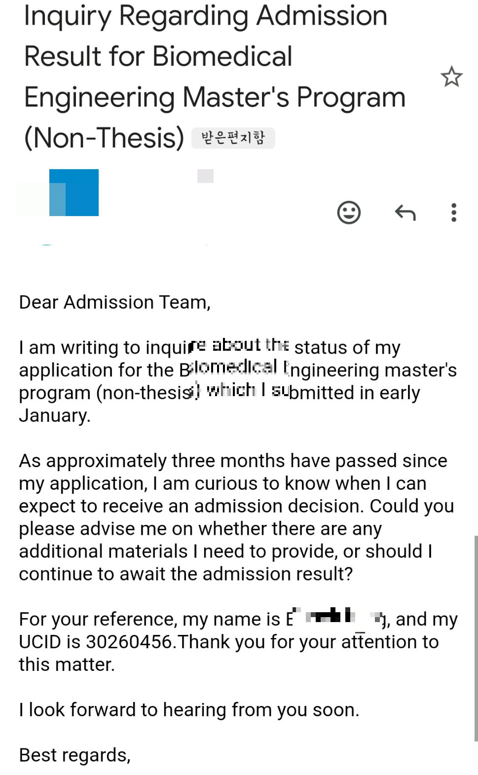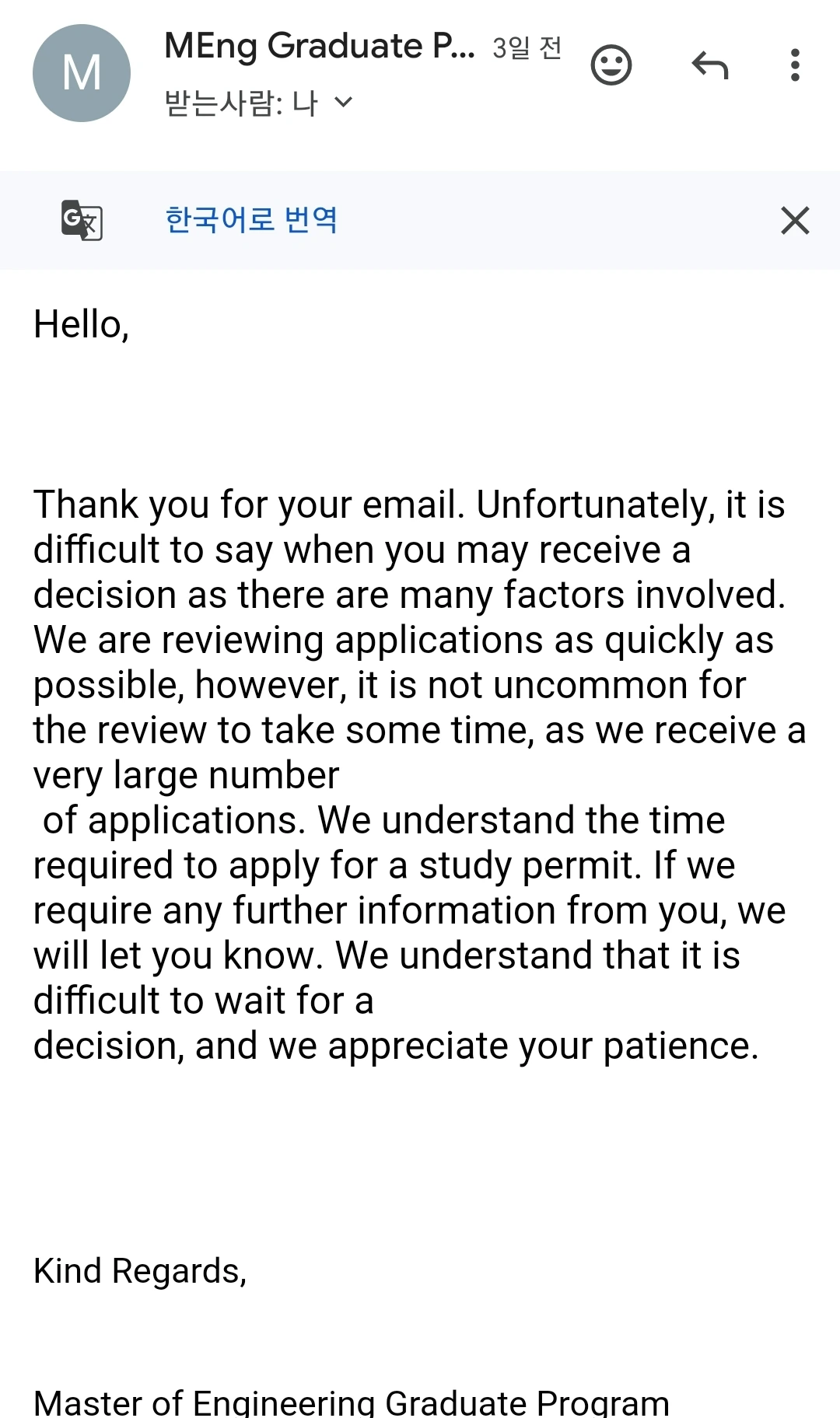4월 말 쯤에 유학원에서 원서 결과를 물어봤다. 나는 아직 답변이 오지 않았다고 했다. 유학원에서는 5월이 되도 안오면 메일을 보내 보라고 했다. 그래서 5월 초가 되자 마자 메일을 보냈다. 솔직히 이런 과정은 유학원에서 해줘야 한다고 생각했는데 캐나다 유학은 유학원이랑 대학의 커넥션이 적은 것인지 직접적인 소통은 없는 것 같았다. 이렇게 메일을 보내는 것도 내가 했다. 메일을 보낸지 한 3일 정도 지나서 답장이 왔다. 원서량이 많아서 언제 결과가 나올지 모른다는 것이다. 그런데 내가 이해가 가지 않는 것은 캘거리 대학교도 롤링 베이스로 이루어지기 때문에 1월 초에 원서를 넣었다면 최소 1달 안에는 결과가 나온다는 것이다. 이미 나 말고 다른 사람들은 결과를 받았다. 나는 속으로 이 대학교가 내 원서를 누락시켰다는 느낌을 받았다. 제대로 확인이나 한건지 의문이 들었다.