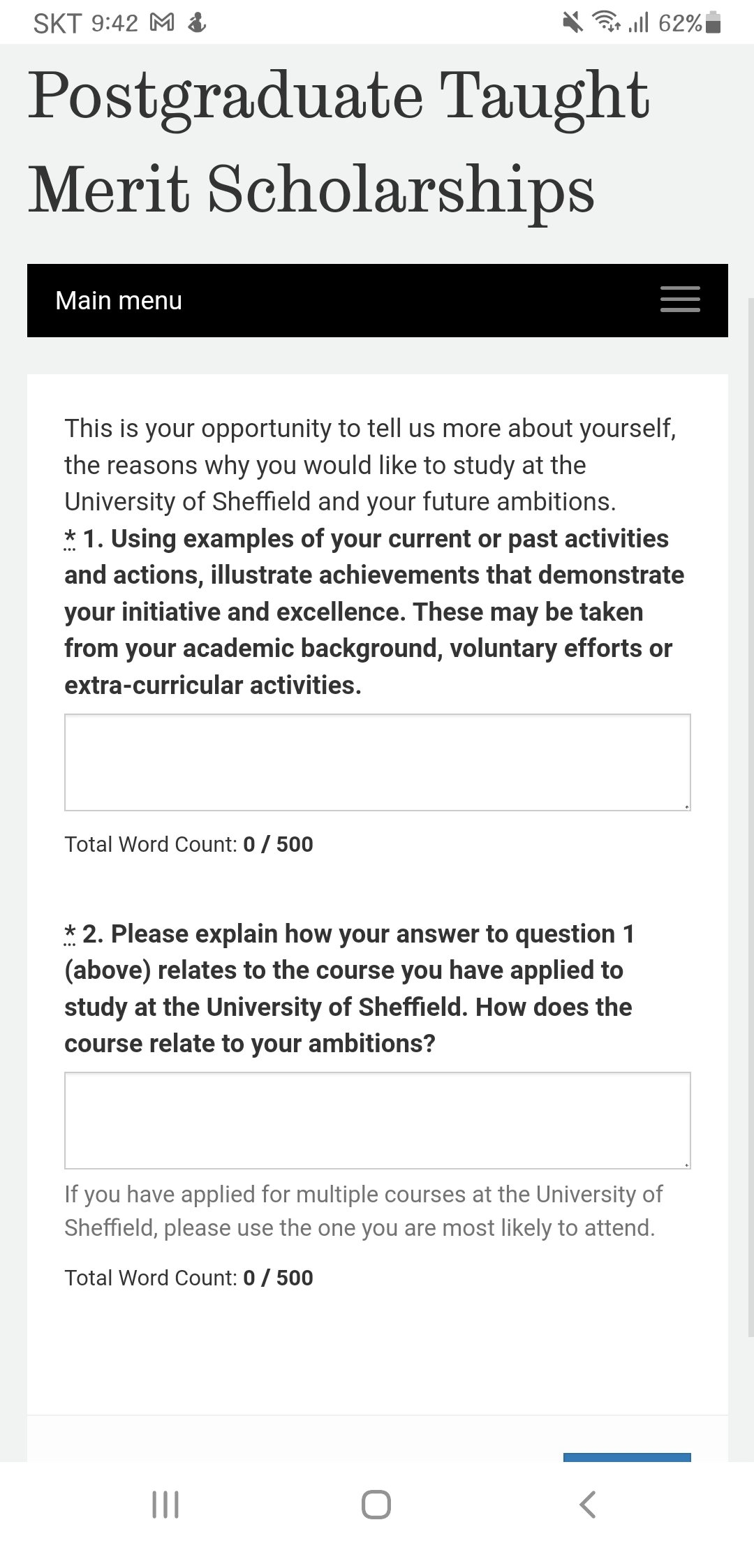 셰필드 대학교의 장학금 신청 기간이 다가왔다. 여러번 장학금을 신청하라는 메일을 받았다. 보통 영국 석사는 셰필드처럼 지원자가 장학금을 신청하는게 아니라 학교에서 장학금 선정자를 따로 고른다. 그래서 학점이 좋으면 장학금을 받을 가능성이 높아진다. 하지만, 영국 석사는 보통 1년이고 외국인 유학생을 캐시카우로 보는 경향이 강하기 때문에 장학 혜택이 없는 경우가 많다. 동남아시아나 인도, 홍콩 등의 출신들은 그 나라 사람들에게 주는 다른 장학금이 있지만 한국은 따로 그런게 없다. 그래서 셰필드에서 제공해주는 장학금이 소중하다. 125명밖에 안뽑지만 만약 뽑히게 된다면 5천 파운드를 받을 수 있다. 5천 파운드라는 것이 많은 돈은 아니지만 쌩돈 내고 다니는 것보단 그나마 낫다. 그리고 어쨌든 장학 수여를 받았다는 것이니 내 이력으로도 추가할 수 있다.
