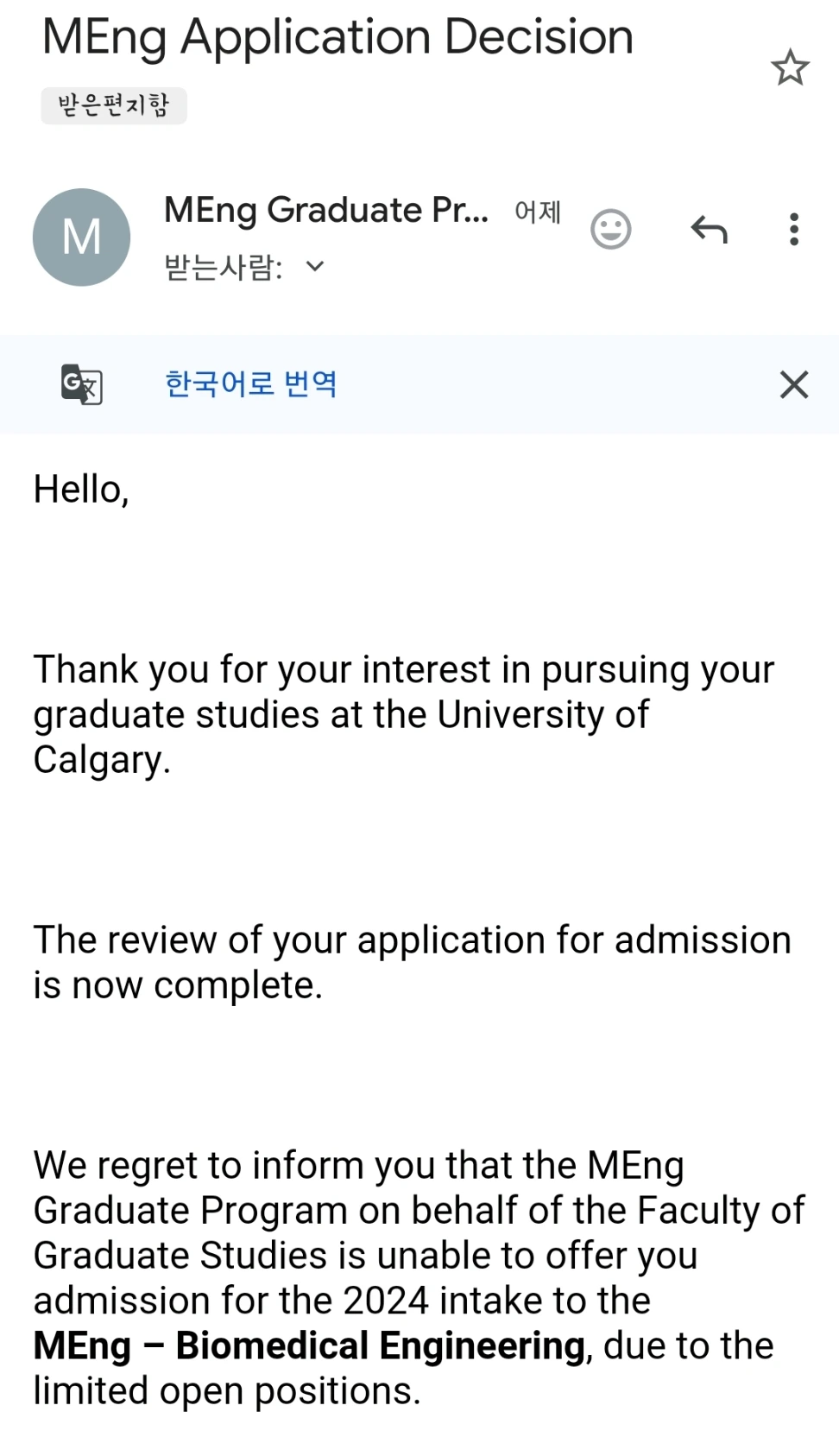 그리고 이번에 캐나다 석사 결과가 나왔다. 어이가 없는게 원서를 1월에 냈는데 5월 초가 되도록 결과가 나오지 않았다. 그래서 내가 탈락했다는 것을 직감했다. 그래도 거절이면 거절 메일을 보내주는게 예의라고 생각한다. 캐나다 석사의 경우 유학원과 같이 했다. 협력을 맺은 학교를 지원하면 유학원이 무료로 원서 서비스를 도와준다. 나는 캘거리 대학교를 지원했다. 유학원과 이렇게 처음부터 작업한건 이번이 처음이었다. 솔직히 말해서 많은 도움이 되었냐고 묻는다면 그렇다고 말은 못할 것 같다. 처음부터 대학을 찾는 일을 내가 거의 다 하다시피 했다. 일부 대학의 경우 코스 지원이 애매하게 되어 있었는데 그에 대한 정확한 답변을 유학원측에서 해주지 못했다. 그리고 지원할 때도 내가 에세이를 완성한 이후 피드백 과정이 없었고 완성된 영어 교정만을 얘기했다. 그런데 영어 교정은 이미 브릿센트에서 받은 터라 그걸 또할 이유가 없었다. 솔직히 말해서 이미 원어민 교정을 받은건데 또 교정하라는 것은 내 에세이를 읽은게 맞는건지 의문이다. 지원과정에서 내가 구체적으로 도움 받은 것은 캘거리 대학교 원서 아이디를 받은 것과 원서 제출 이후 다른 사이트에 가서 서류를 업로드 해야 했는데 이때 대신 해준 것이다. 원서 지원 이후에는 별다른 연락을 하지 않았다. 결과가 나오지 않았기 때문이다.