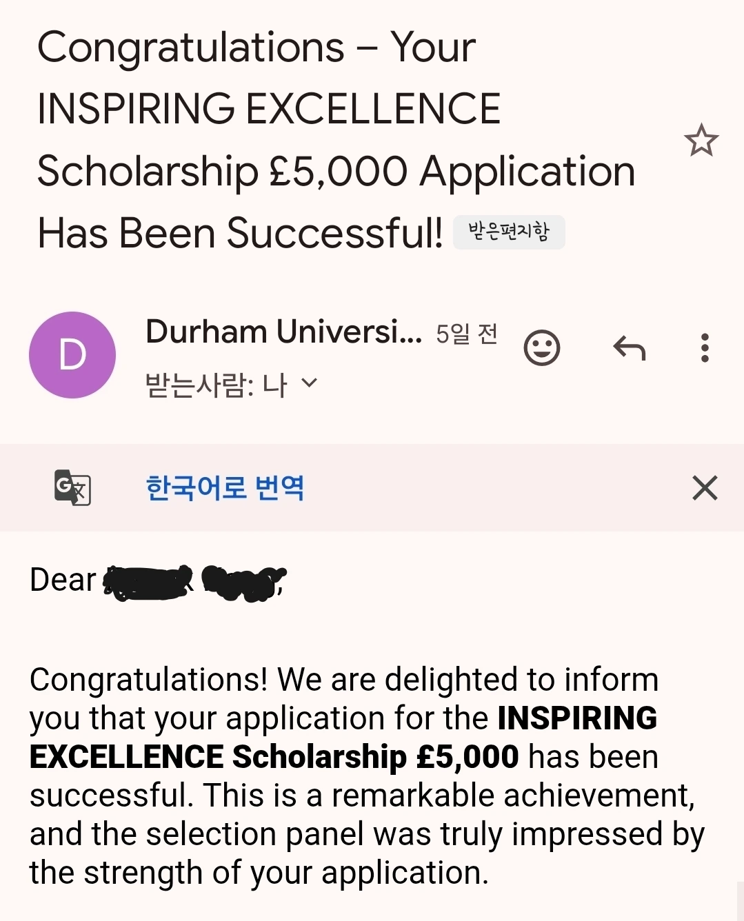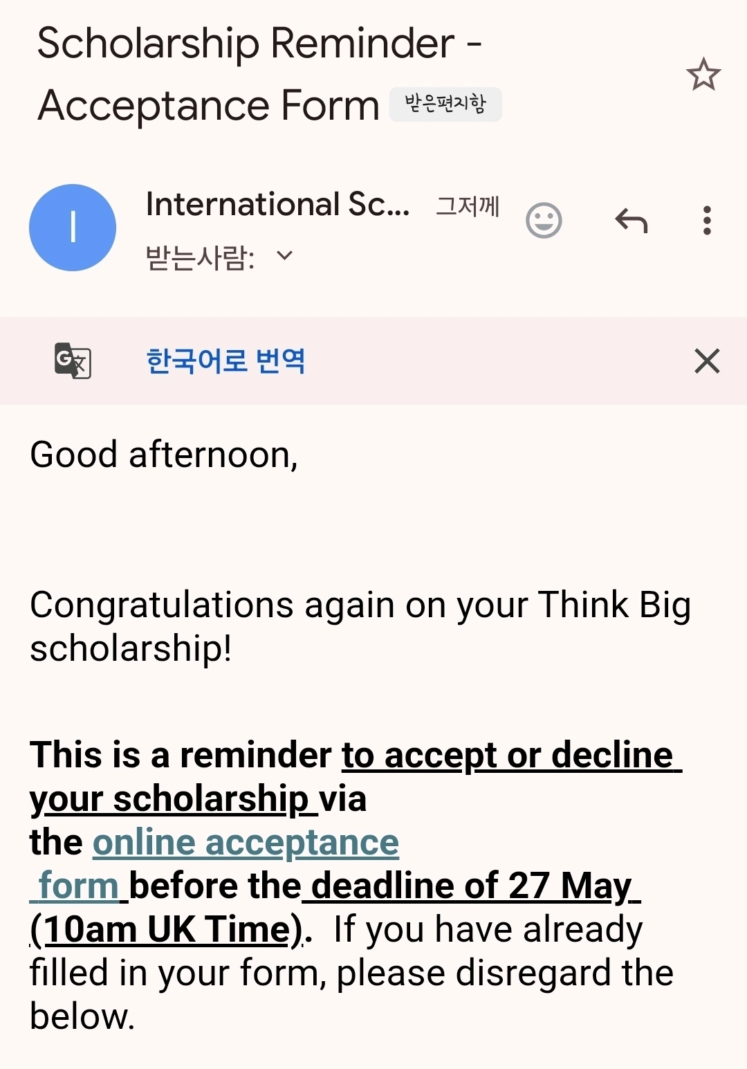 이전 글에서 장학금으로 인해서 유학을 고민하고 실망한 것을 적었다. 나는 나름 글쓰기에 자신도 있고, 내 스토리도 장학금을 타기에는 부족함이 없다고 생각했는데 내 스펙이 부족한가 싶었다. 장학금 결과가 나올 때가 되었는데 아무런 이메일이 오지 않아서 다시 학교 홈페이지를 들어가서 찾아봤다. 장학금 신청 마감은 1차가 4월 30일, 2차가 6월 8일이었다. 그리고 selection이 1차가 5월 4일, 2차가 6월 8일이라고 되어 있었다. 5월이 한참 지났는데도 결과가 나오지 않았기 때문에 나는 자동적으로 2차로 내가 밀려난 줄 알았다. 하지만, selection 과정이 오래 걸렸던 탓인건지 5월 17일 오전 6시 34분에 이메일이 하나 도착했다. 내가 inspiring scholarship에 합격했다는 것이다. 그래서 5천 파운드의 장학금을 수상하게 되었고 이번 달 말까지 디파짓을 내라는 통보를 받았다.