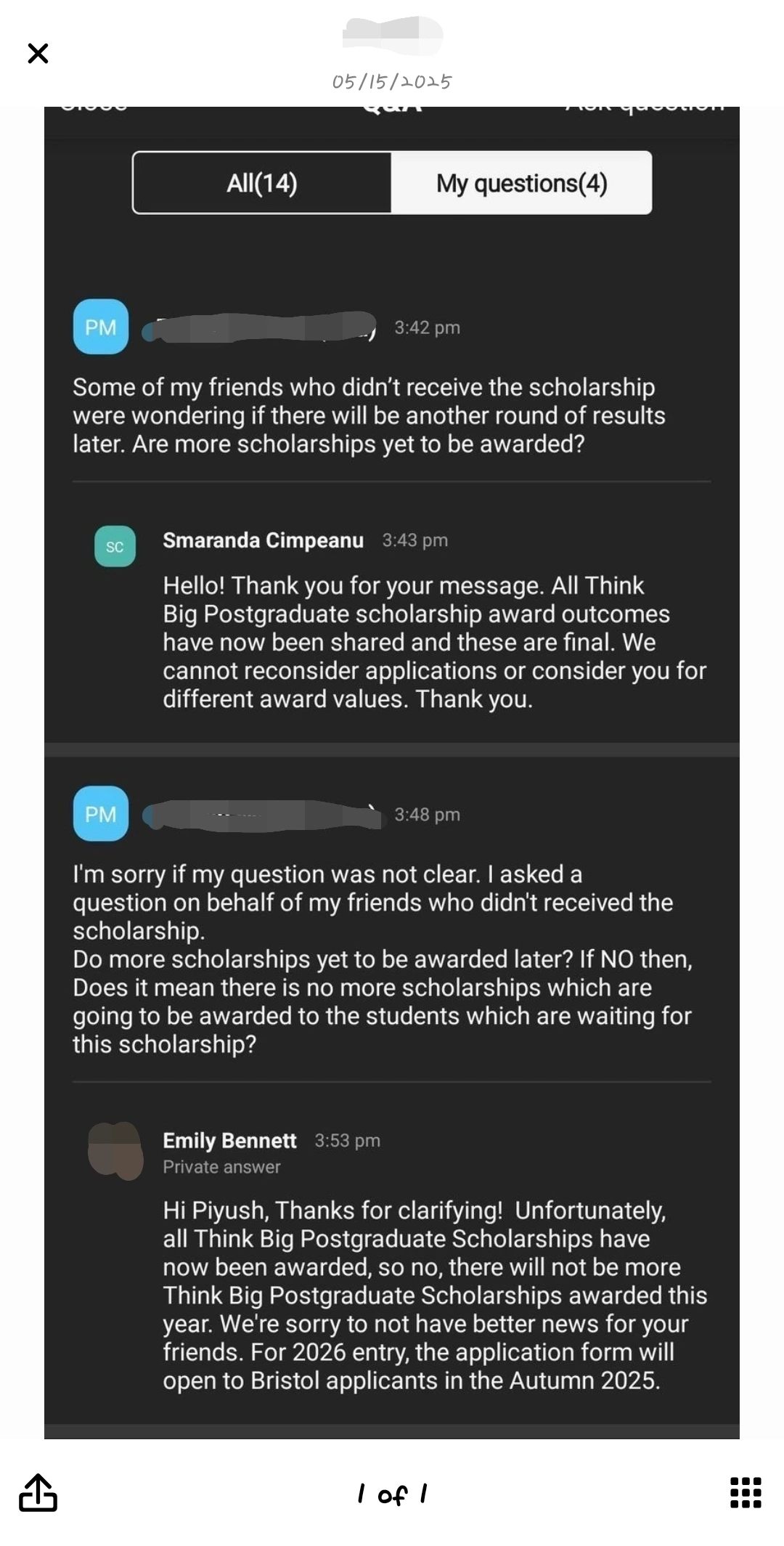 그런데 5월 20일에 오후 6시쯤에 갑자기 64로 시작되는 국제전화가 하나 왔다. 내가 핸드폰을 무음으로 설정해놓아서 전화를 받지 못했다. 메일 알람으로 브리스톨 대학교가 전화를 했었는데 내가 받지 않았다고 왔다. 학교가 왜 갑자기 전화를 한건지 이해가 가지 않았다. 아니 장학금도 안주는 주제에 쌩돈 다내고 갈 캐시카우가 절실했던 것인지... 속으로 욕하고 있었다. 그리고 그 날 저녁 때 갑자기 학교에서 메일이 하나 왔다. 내가 Think Big에 붙었다는 것이다. 근데 이상하게 얼마를 받은 것인지 내용이 없었다. 그래서 브리스톨 대학교에서 운영하고 있는 왓츠앱 inquiry 로 들어가서 문의를 남겼다. 학교 측에서는 인터내셔널 장학금 팀에 메일을 보내는게 가장 빠를 거라고 했다.