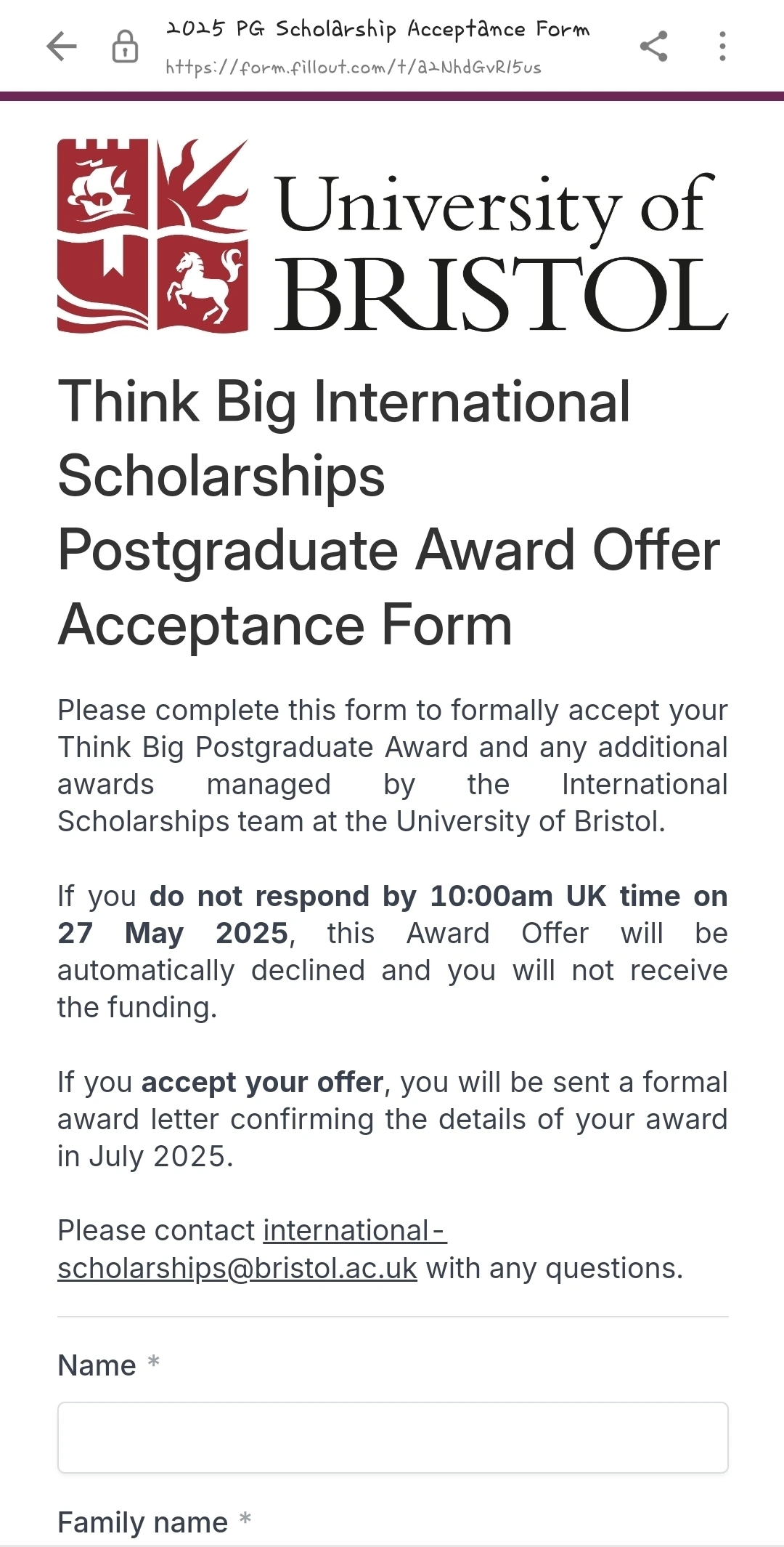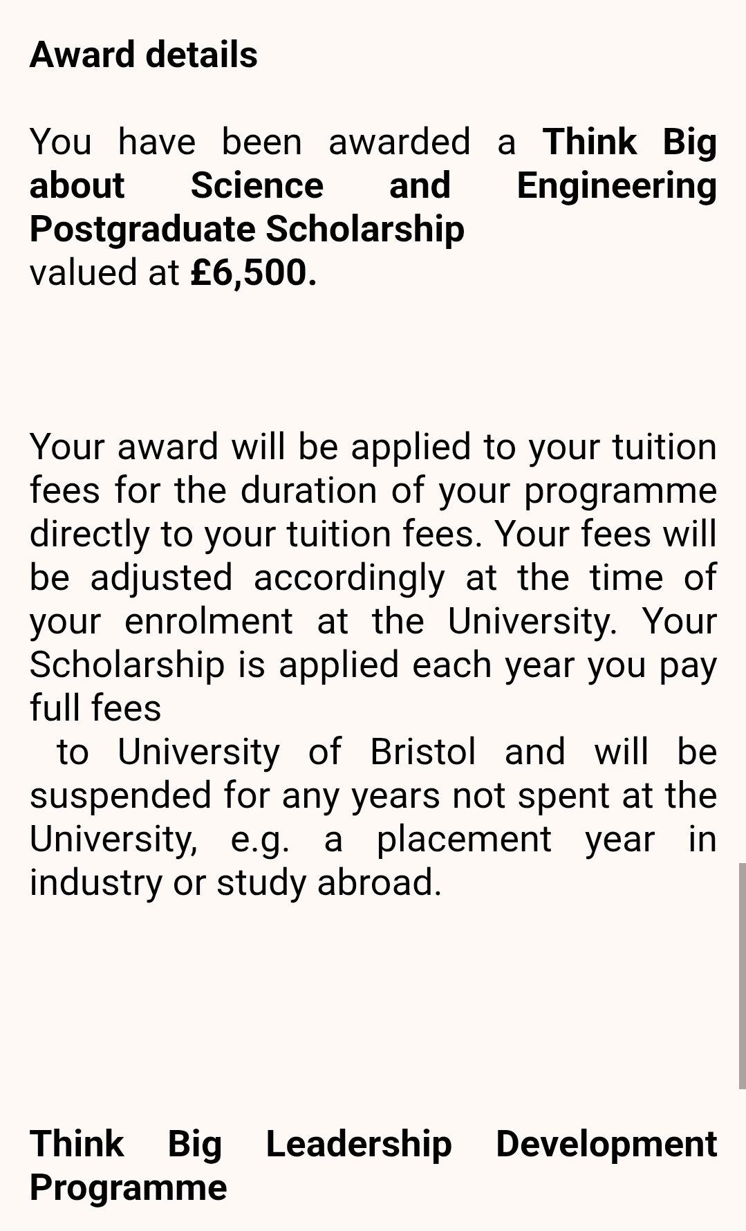그렇게 저녁 늦게까지 기다렸지만 학교로부터 연락이 오지 않아서 메일을 잘못 보낸건가 싶었다. 워낙 유럽은 행정처리도 느리고 하다 보니 전산 실수를 했나보다 했다. 그 다음 날에 Goin 앱에서 나와 같은 메일을 받은 사람이 있다는 것을 알게 되었다. 그 중 한 명이 메일로 온 acceptance form 을 적으라고 해서 바로 이걸 적었다. 그랬더니 2시간 정도가 지나서 장학금을 수여받았다는 것을 알게 되었다. Think BIg 장학금은 제일 적은게 6,500이고 그 다음 13,000, 26,000 이렇게 준다. 나는 13,000 파운드를 받고 싶었지만 지금은 6,500이라도 어딘가 싶다. 단톡방만 보면 26,000을 받은 사람은 없었고 13,000 받은 사람이 한 명 정도 보였다. 그 방에 대략 100명 정도의 인원이 있기 때문에 이 방에 들어오지 않은 누군가가 탄 것 일 수도 있지만 큰 액수의 장학금은 소수에게 주어지는 것 같다. 정확하게 이 장학금이 몇 명한테 주는 것인지는 모르겠다. 하지만, 1만 파운드 정도의 장학금을 주는 학교를 보면 100명도 안주기 때문에 브리스톨 또한 이와 비슷하지 않을까 싶다. 큰 액수는 내 생각에 한 자릿수로 준 것 같고 6,500 파운드 장학금이 두자릿 수 정도에게 준 것 같다. 나중에 7월에 그럴싸한 오퍼레터를 만들어서 준다고 하니 기대 중이다.