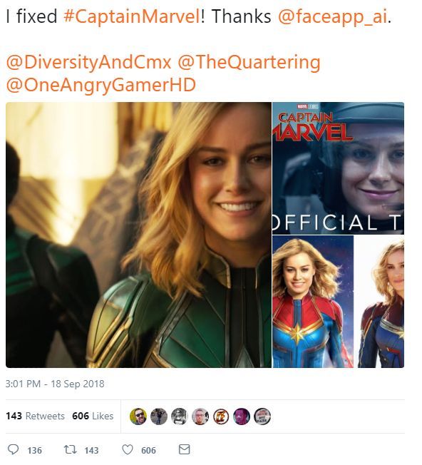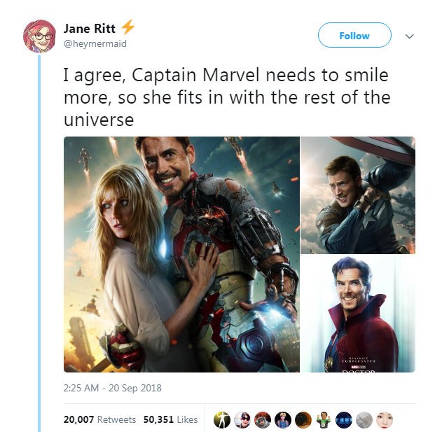 예고편 공개 후 국내 뿐 아니라 해외에서도 해프닝이 있었다. Flinging Monkey(@TFMonkeyYoutube)라는 트위터 유저가 캡틴 마블이 왜 웃지 않냐 그녀의 미소를 보고 싶다며 예고편에 등장한 주인공의 얼굴을 환하게 웃는 표정으로 합성해 버린 것이다. 이를 보고 많은 이들이 실소하던 중 Jane Ritt(@heymermaid)라는 유저가 “맞아. 캡틴 마블은 좀 웃을 필요가 있어. 그래야 다른 동료들과 잘 어울릴 테니까.”라며 비꼬는 코멘트와 함께 남성 히어로들이 등장한 포스터를 웃는 표정으로 바꿔버린 사진을 올렸다. Flinging Monkey의 트윗이 불과 500번 가량 RT된 데 반해 이를 비판한 Jane Ritt의 트윗은 2만 가까이 RT되고 5만이 넘는 유저들로부터 ‘좋아요’를 받았다.