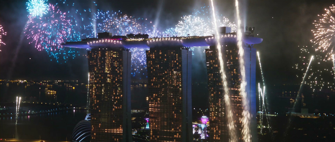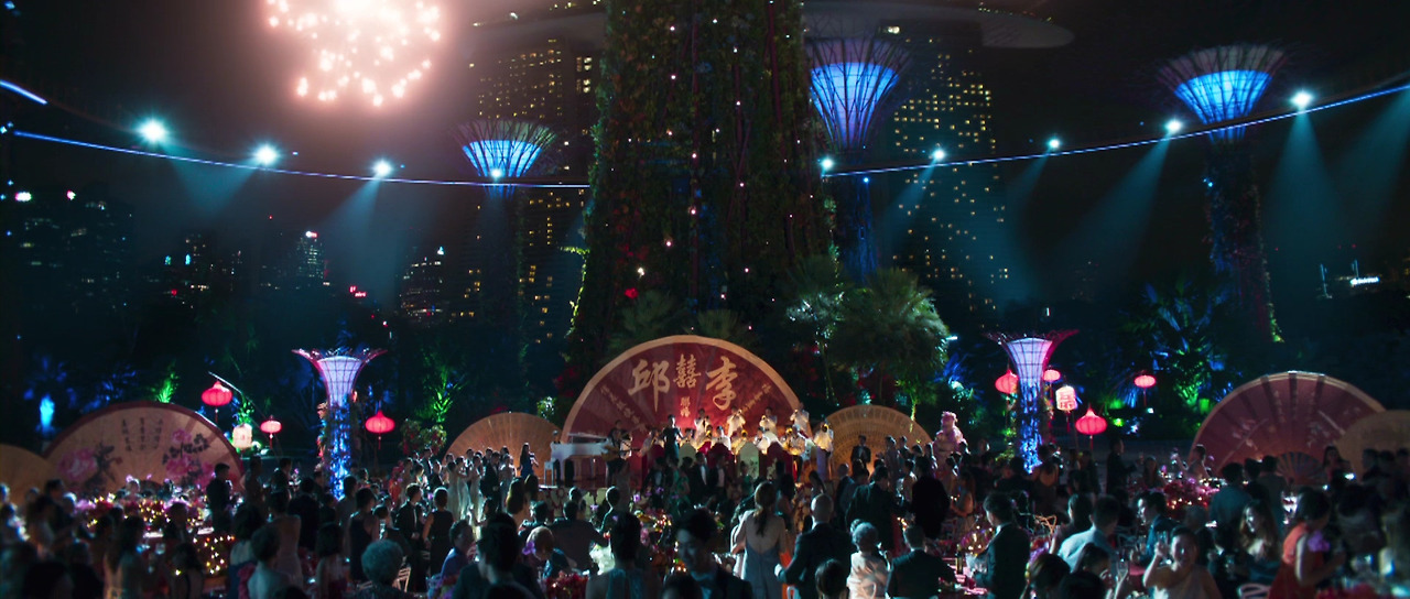 결혼식이 끝나고, 호화로운 피로연이 이어진다. 서로의 변치 않는 마음을 확인한 레이첼과 닉은 달콤한 시간을 보내는데 갑자기 닉의 할머니가 이들을 호출하고 상황은 복잡해진다. 이 장면에서 화려한 피로연이 열린 야외공간은 싱가포르의 관광명소 중 하나인 ‘가든스 바이 더 베이’다.