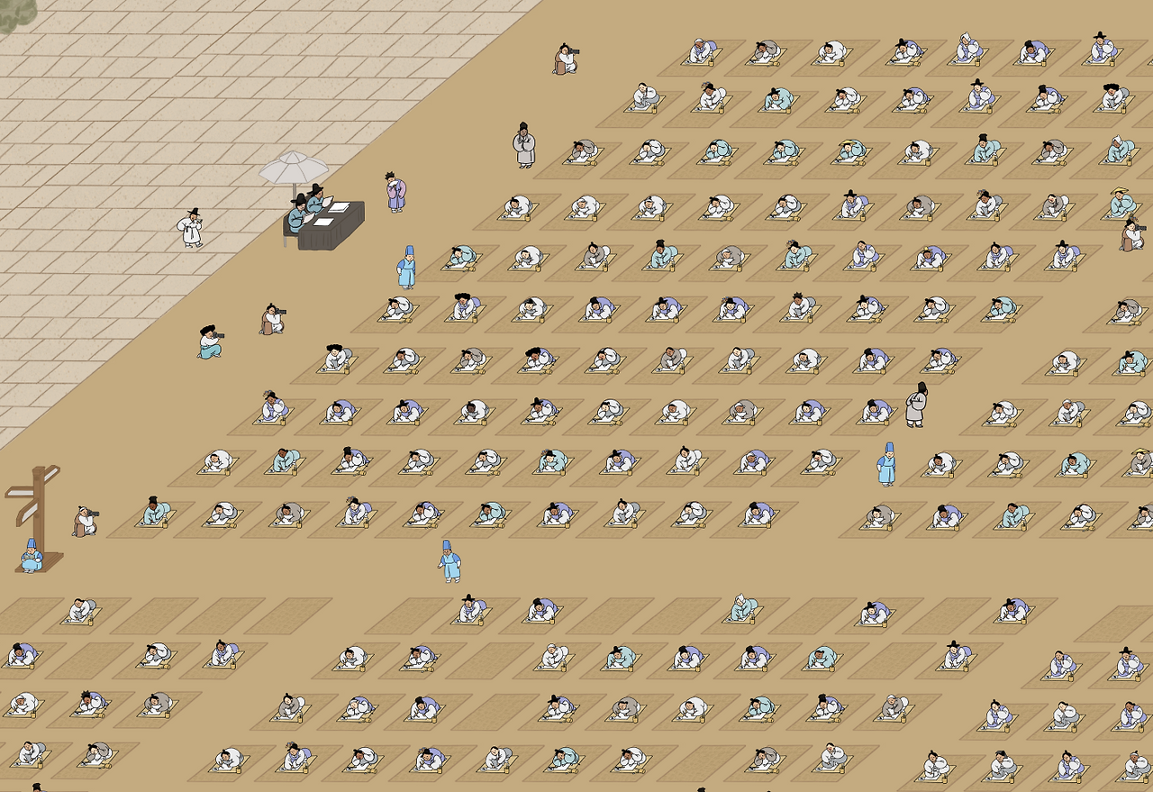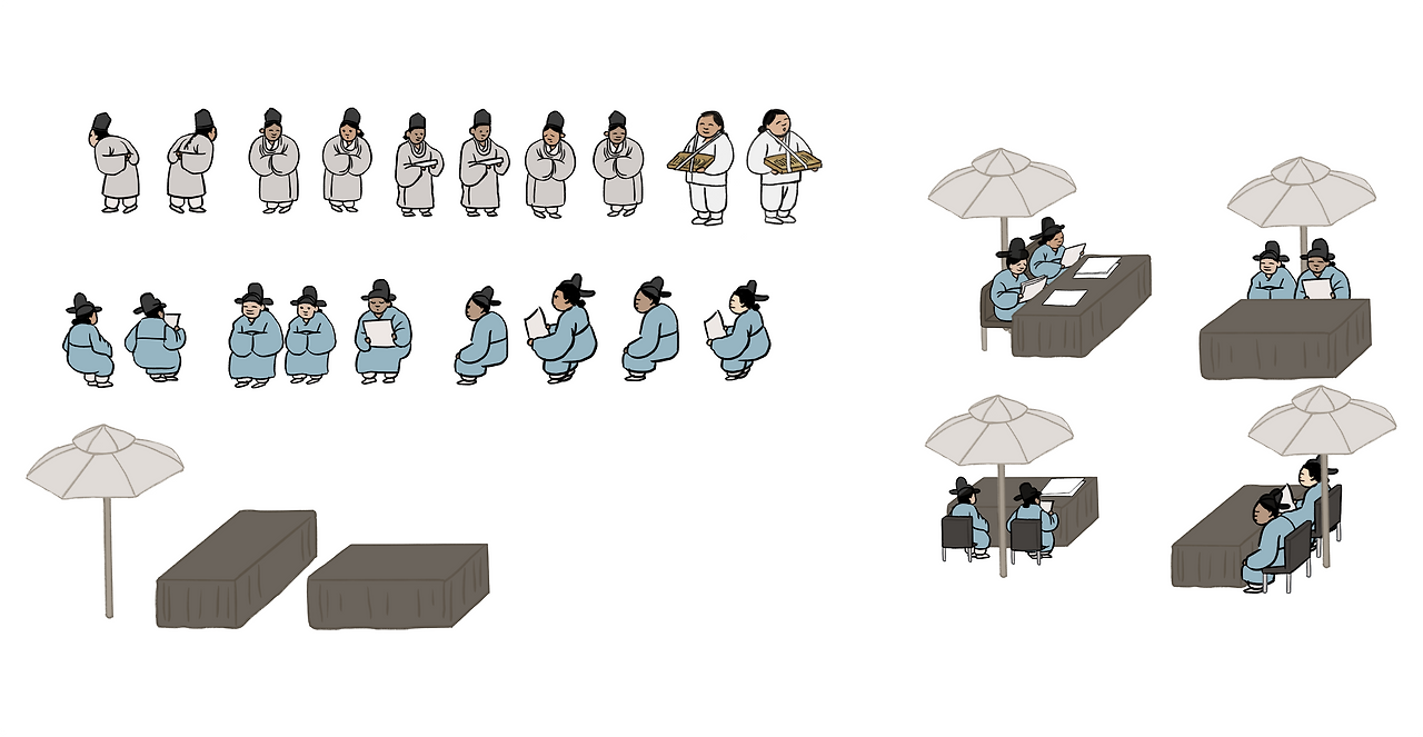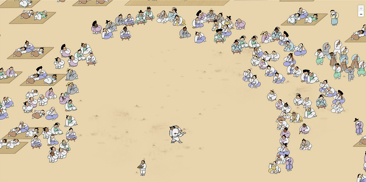캐릭터가 풍속화 배경 위에서 주변 캐릭터들과 자연스럽게 어울릴 수 있도록 신경 써서 배치했어요.