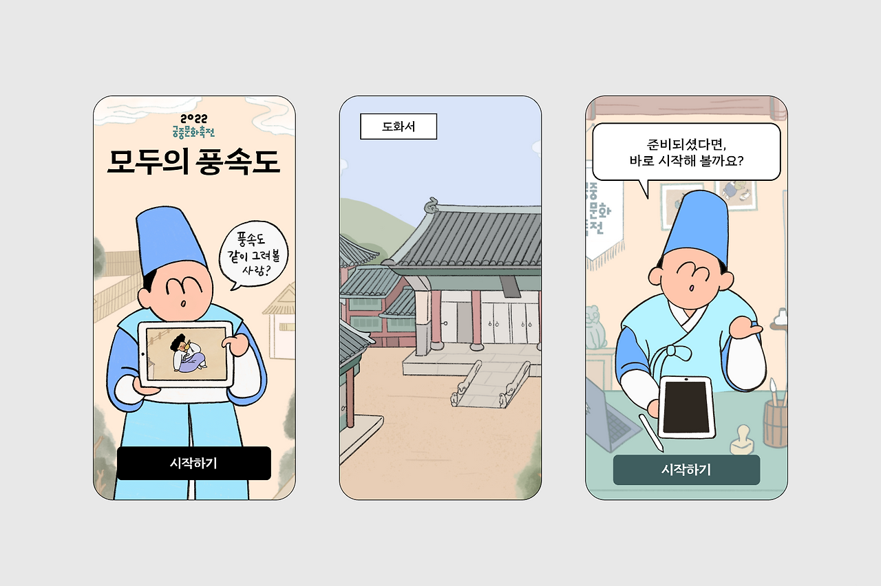 모두가 함께 만드는 21세기 풍속도 : 〈모두의 풍속도〉는 궁중문화축전을 알리기 위해 제작된 온라인 콘텐츠입니다. 참여자는 웹사이트에서 머리 모양, 표정 등 다양한 옵션을 눌러보며 풍속도에 등장할 인물을 만들어 볼 수 있습니다. 이벤트가 종료되면, 참여자가 만든 캐릭터를 바탕으로 결과 풍속도를 제작하여 공개합니다.
