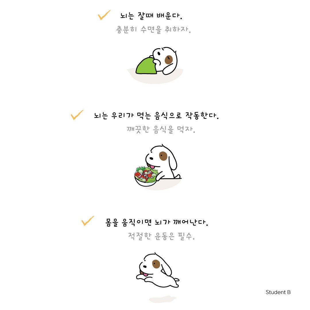 1 공부를 잘하기 위해서는 충분히 자고, 깨끗한 음식을 먹으며, 적당한 운동을 하는 것이 중요하다. 건강한 뇌는 마음을 평온하게 만들고, 평온한 마음은 결국 최고의 학습 효율로 이어진다.