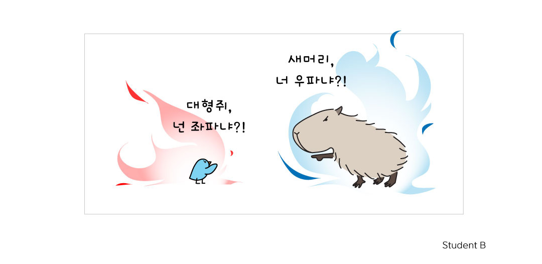 자존심이 상할 대로 상한 파랑새가 발톱을 세우며 카피바라의 머리털을 쥐어뜯으려 들었고, 위험을 감지한 카피바라는 급히 뒤로 물러서며 외쳤다.