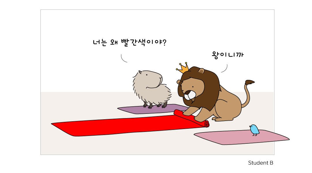 동물들은 흠칫 놀라며 목소리가 난 방향을 돌아보았다. 모두가 흑표범이 다시 나타난 줄 알고 숨을 삼켰지만, 그곳에는 요가 매트와 요가 책을 양손에 든 사자가 서 있었다. 사자는 깊은 숨을 들이마신 뒤 말했다.