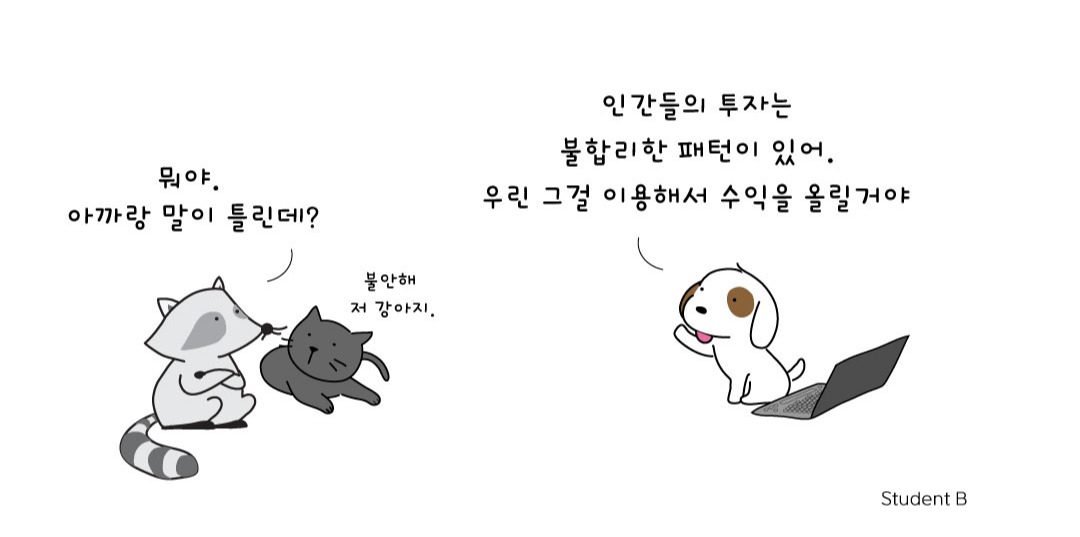 2) 강아지가 파악한 주인의 비합리적인 행동은 확증편향 (사람들이 자신이 이미 믿는 것을 뒷받침해 주는 정보에 더 관심을 갖는 것), 손실회피 (이익과 손실이 동일해도 손실을 더 회피하려는 경향) 등 한두 가지가 아니다. 심리학자 다니엘 카네만이 '인간은 비합리적'이라는 연구로 노벨경제학상을 탔을 때 강아지가 이렇게 말했다고 한다. "뭐야. 나는 진작에 알았는데."