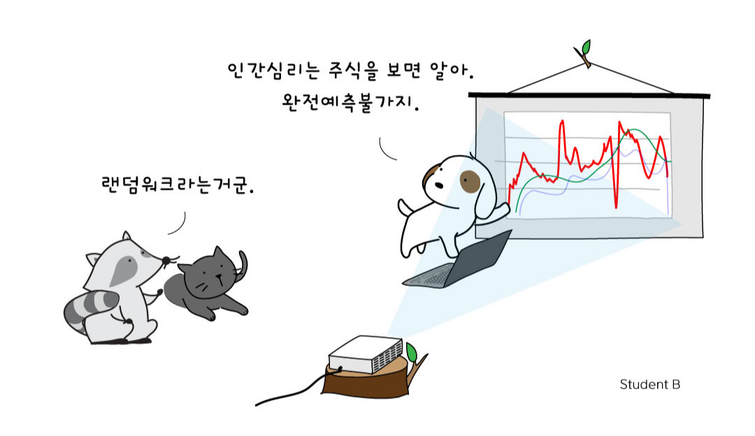 3) '랜덤 워크'라는 것은 마치 술 취한 사람이 다니듯 주가를 예측할 수 없음을 의미한다. 반면 비합리적이라도 패턴이 있다면 시장을 예측할 수 있다. 예측이 안된다면 돈을 버는 것을 운에 맡겨야 하고, 예측이 된다면 강아지는 지속적인 수익을 올릴 수 있을 것이다.