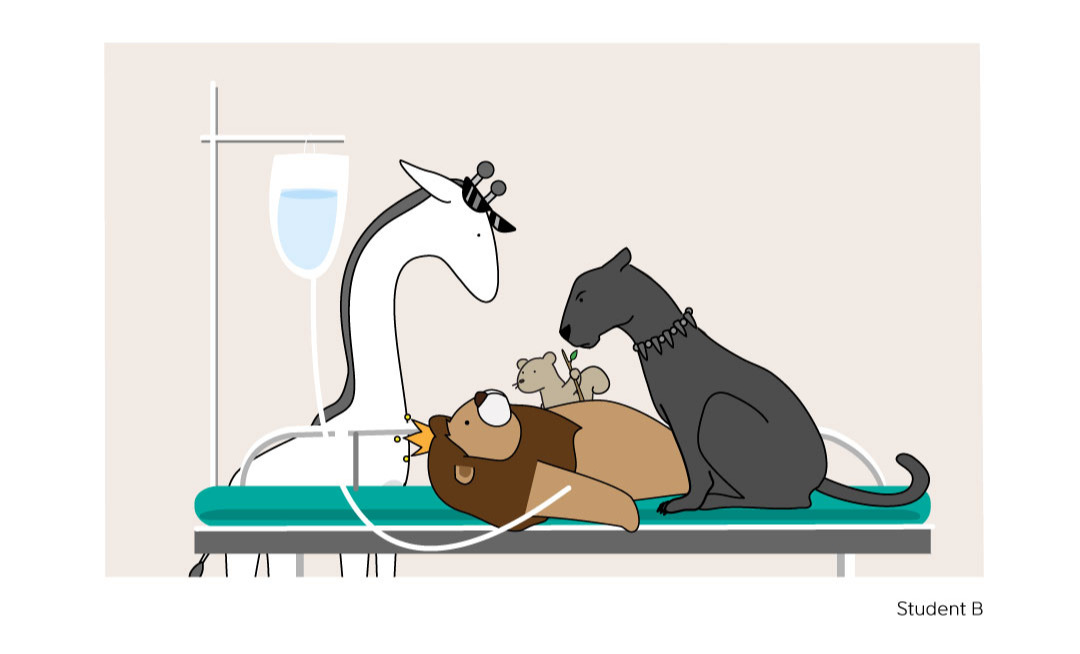 사흘이 더 지난 뒤, 사자는 겨우 혼자 앉을 수 있을 만큼 회복되었다. 그리고 마침 문병을 온 기린, 흑표범, 그리고 다람쥐와 함께 이야기를 나누고 있었다.